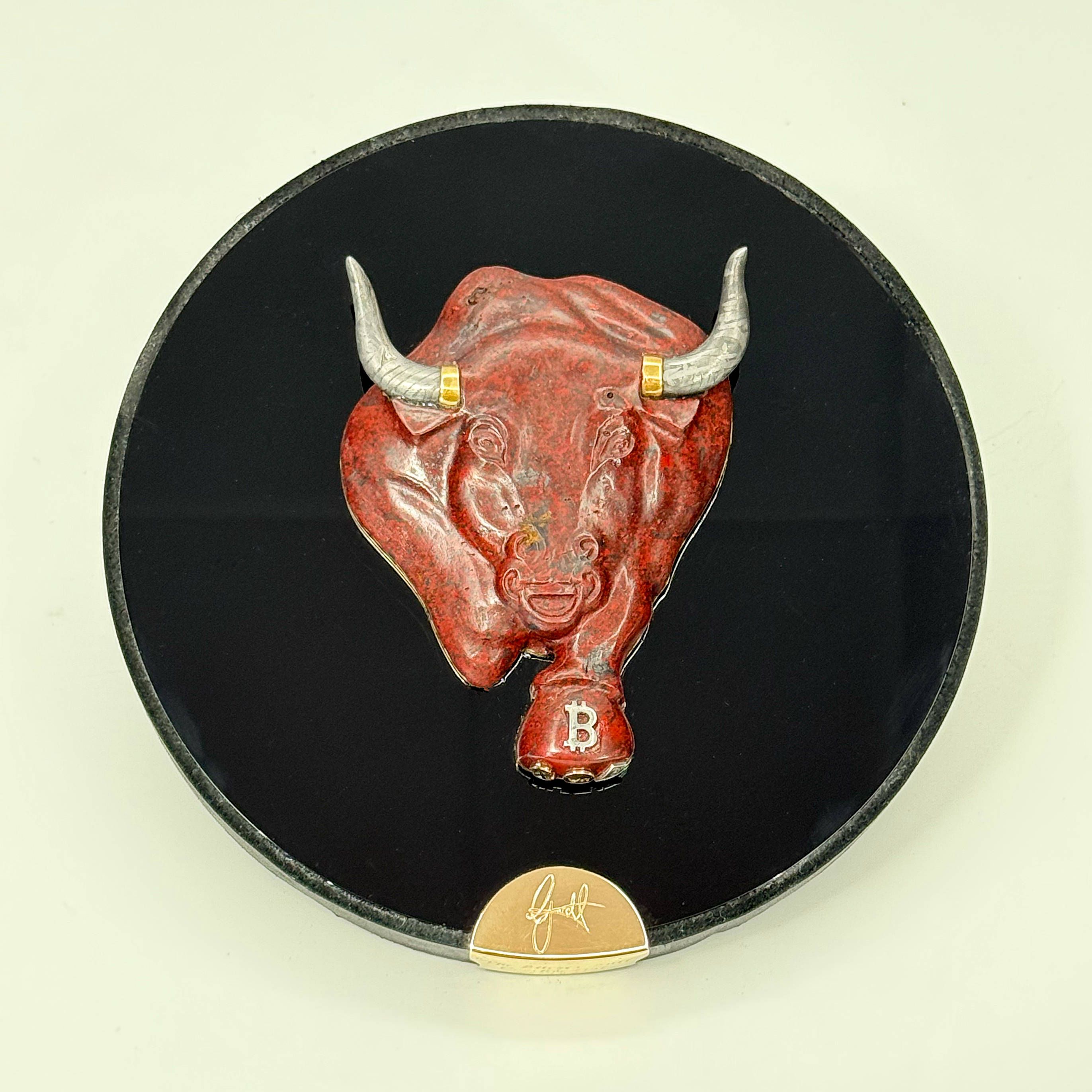 A Brass "Sun" hand-engraved with my signature, anchors the Bull. This is engraved with the title, and the block-height of #893825