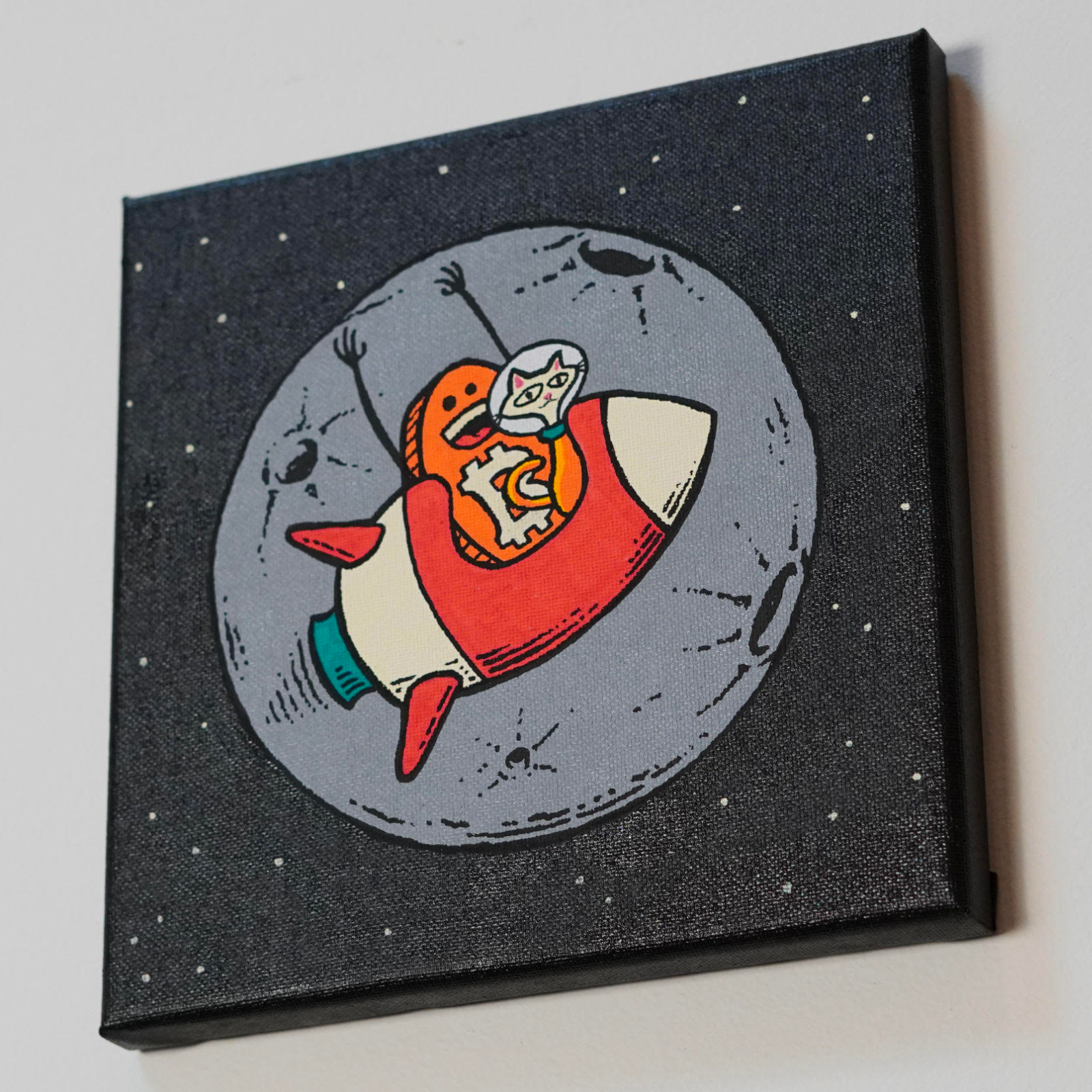 To The Meown features Coaster Guy and Space Cat going to the moon in their rocket. Inspired by Hodlonaut — this piece was made specifically to help raise money for his legal defense.