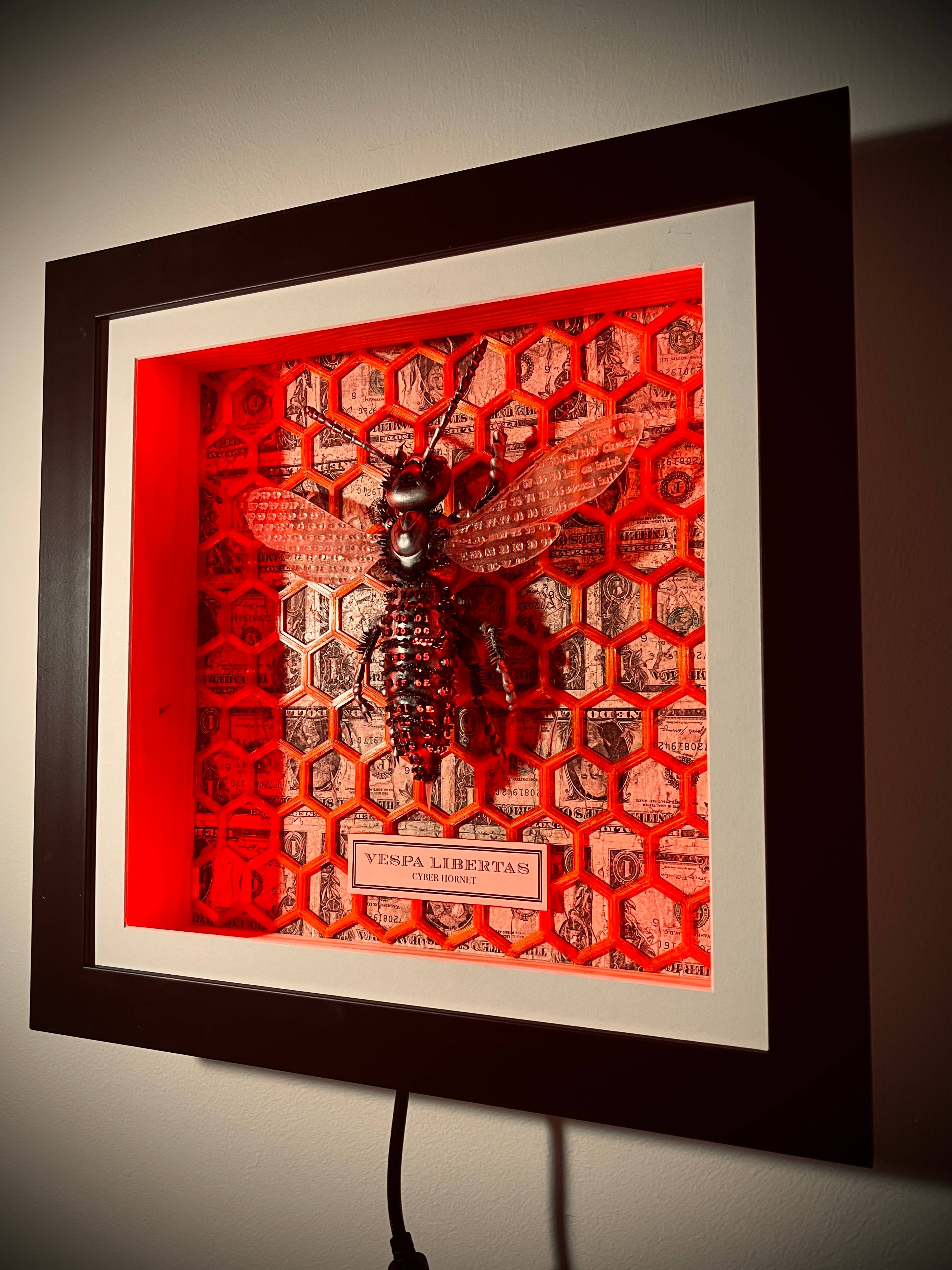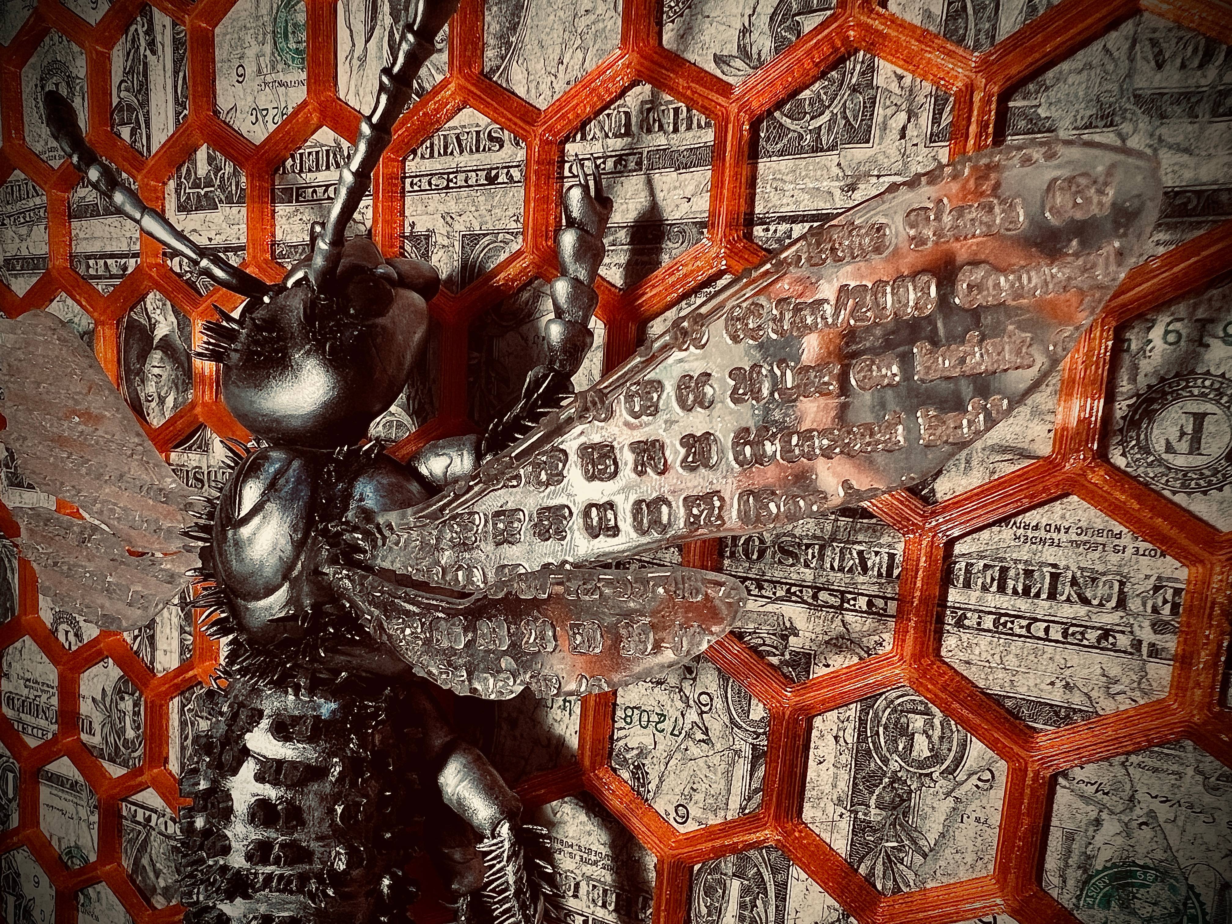 he orange Bitcoin hive it constructs stands out boldly against the backdrop of a broken fiat system, turned upside down to highlight its obsolescence. The hornet is responsive to the Bitcoin time chain, with both the frame and the thorax of the hornet changing color dynamically via an LED array based on live data.