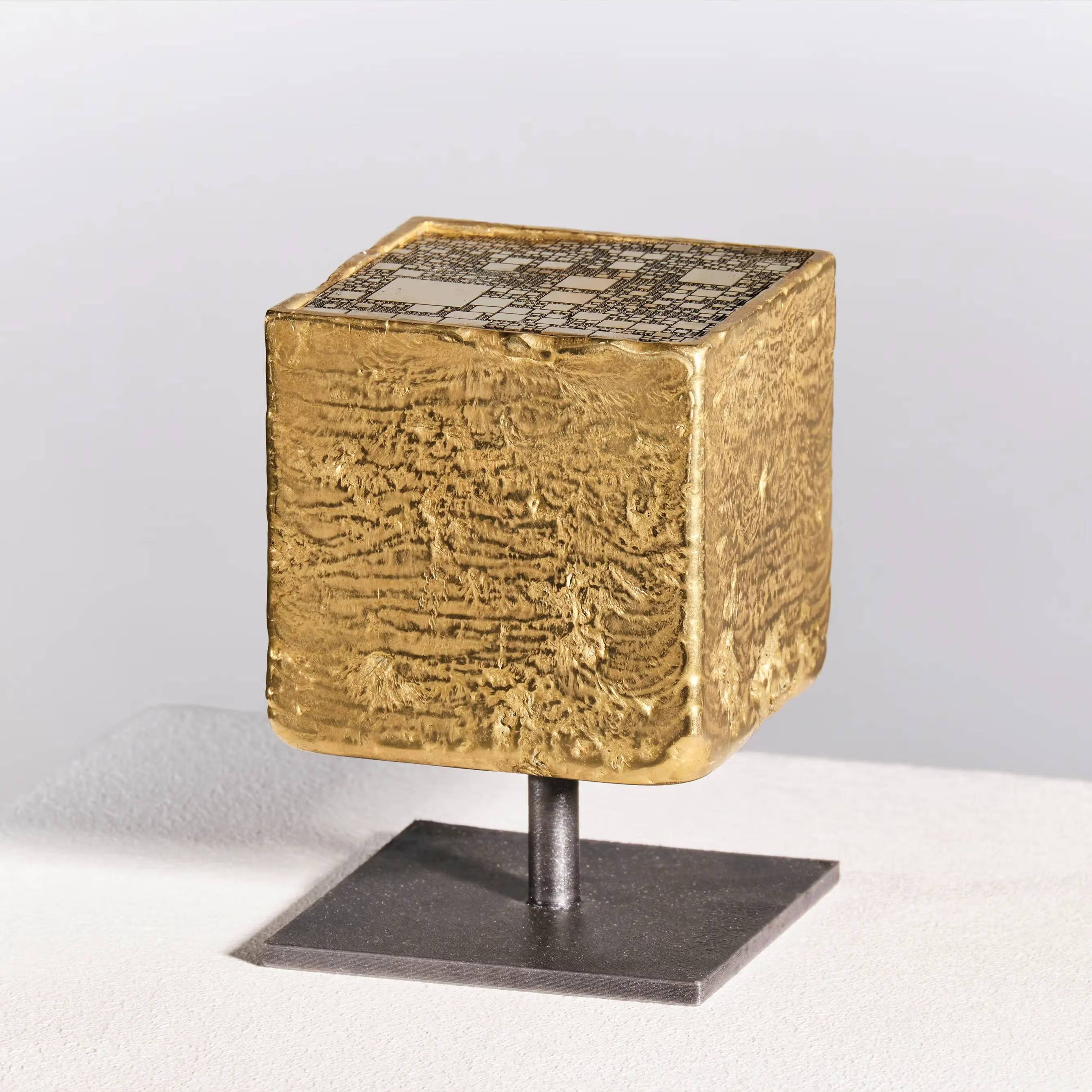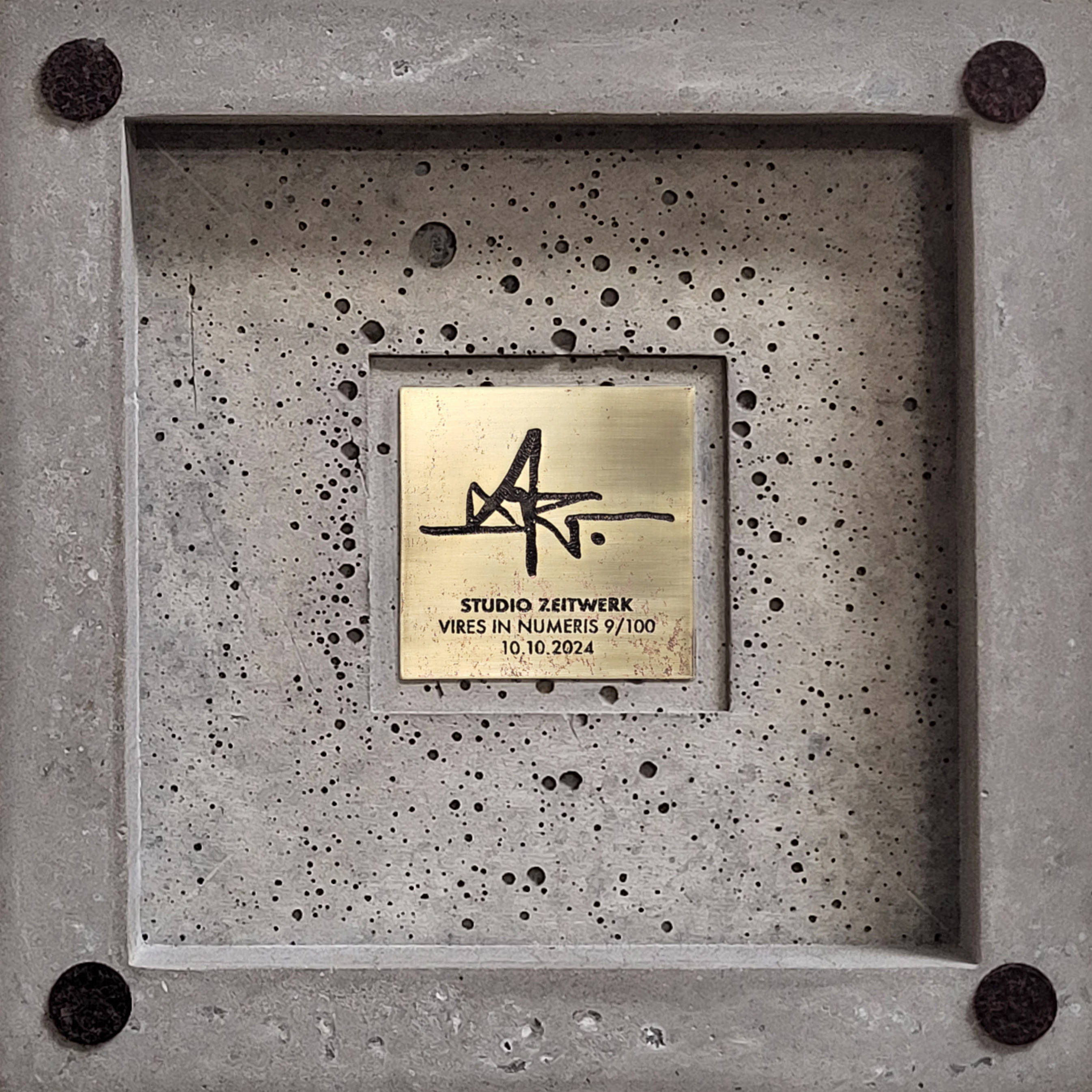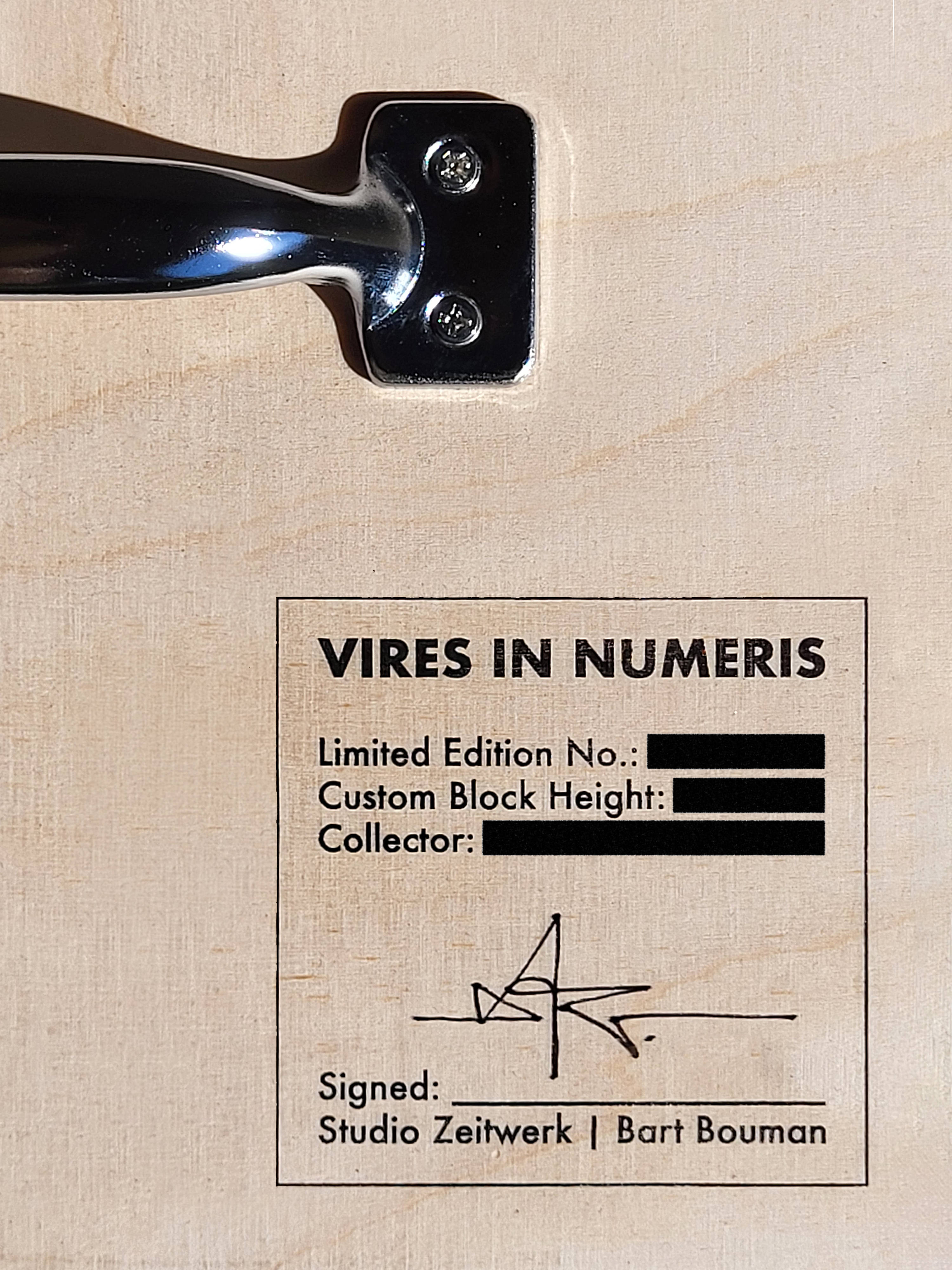 Vires in numeris is part of a strictly limited edition of 100 unique sculptures, each made to order and individually engraved. While every piece shares the same conceptual structure, no two are exactly alike — each one is anchored in its owner’s story, time, and block.
