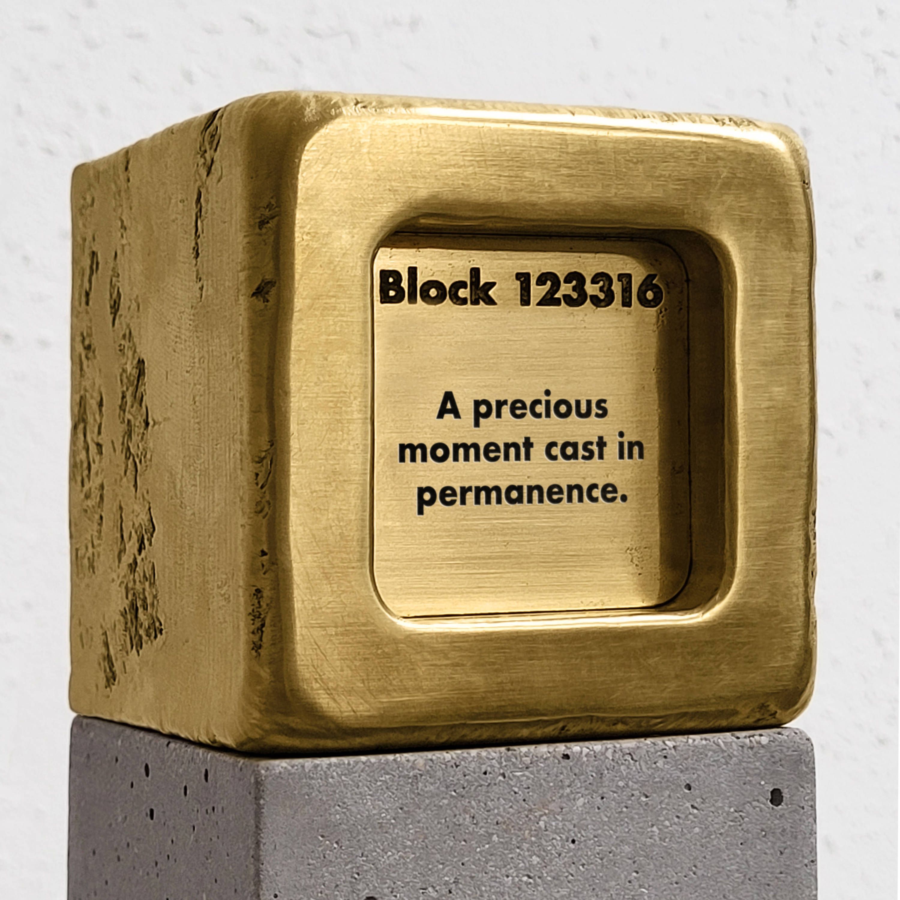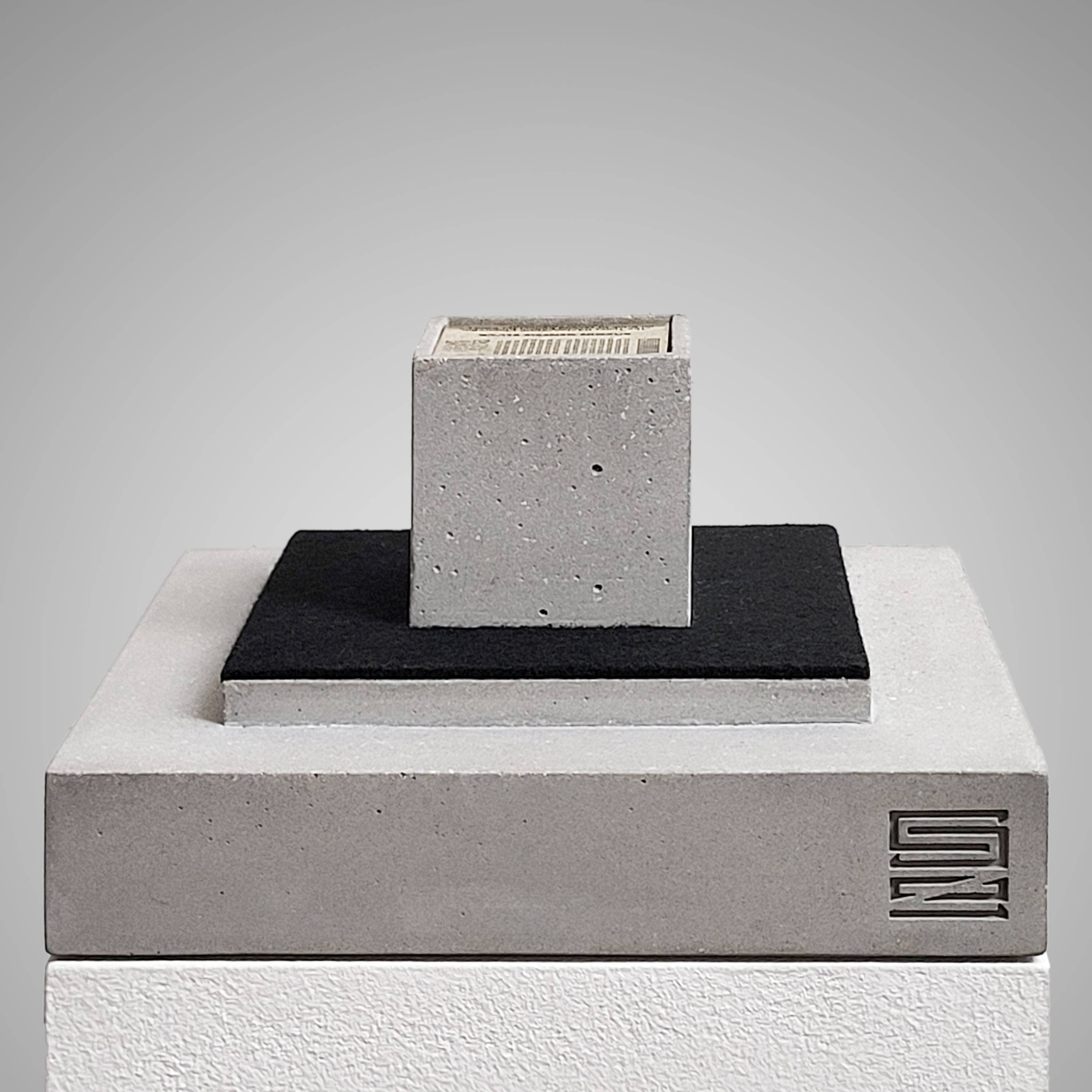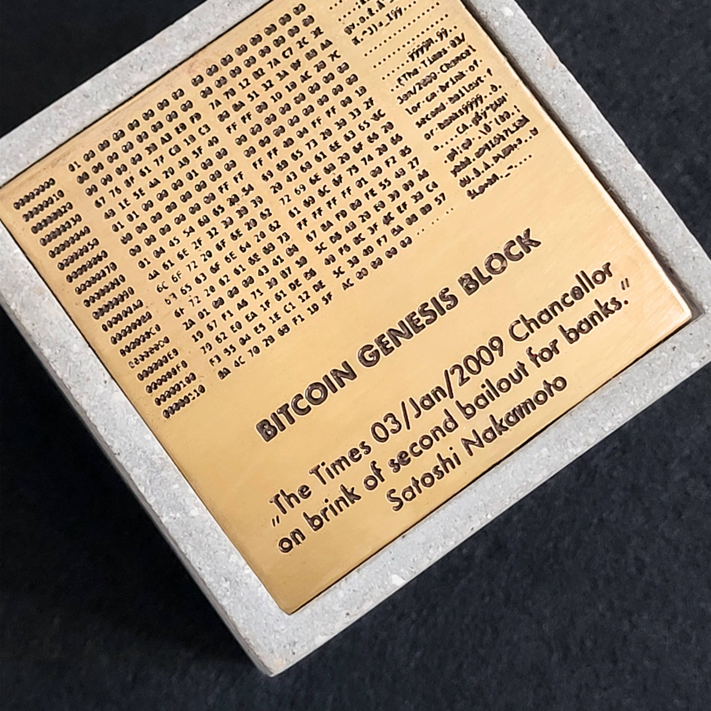 The sculpture rests on a multilayered concrete base, evoking the weight and permanence of hard money. A layer of deep black felt cradles the upper block — a subtle nod to preservation, reverence, and stillness. It also honors the invisible work beneath: decades of cryptographic research and cypherpunk vision, without which this foundation could not exist.