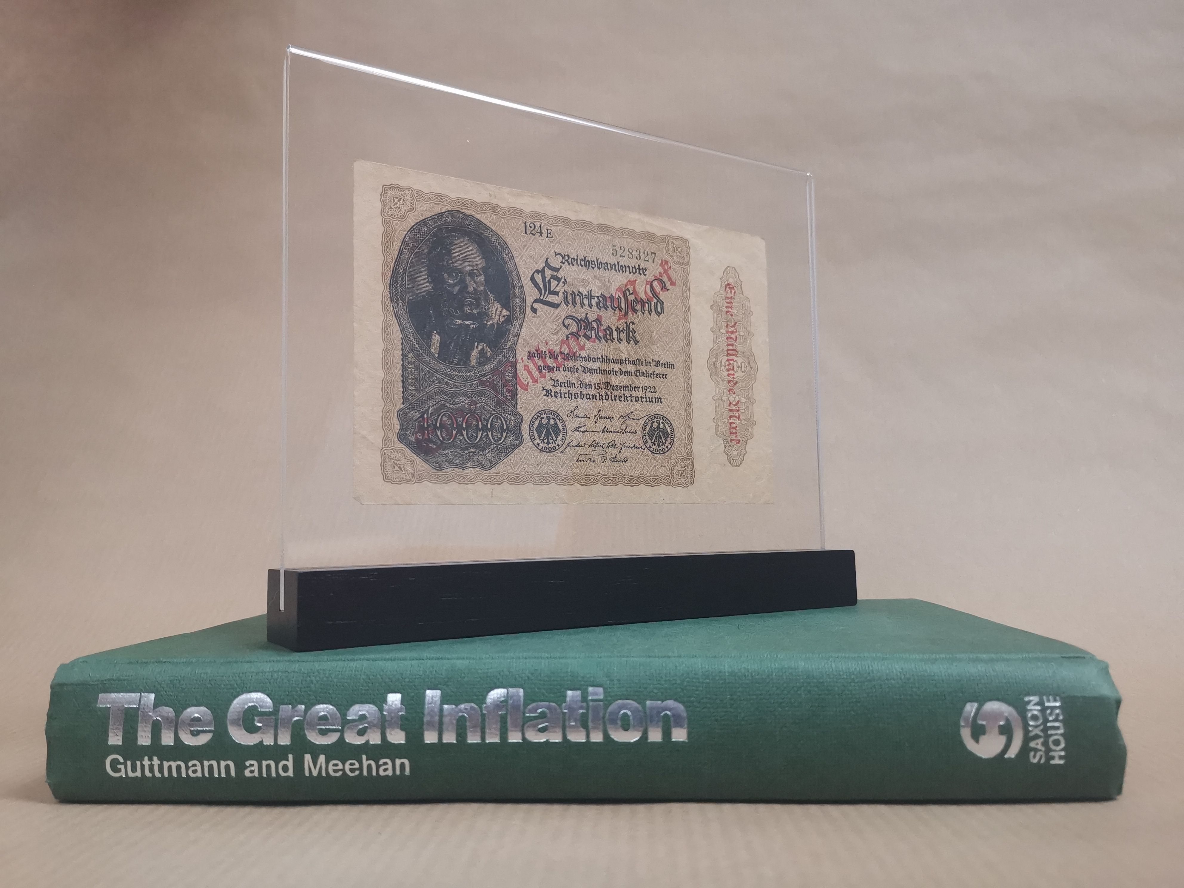 A rare book "Great Inflation: Germany, 1923" (1975) which is impossible to find in electronic format. Other authors for example Adam Fergusson frequently refer to Guttman. We add the original overprinted Weimar bill so-called "Brown Rag" as the reader may find from said book.