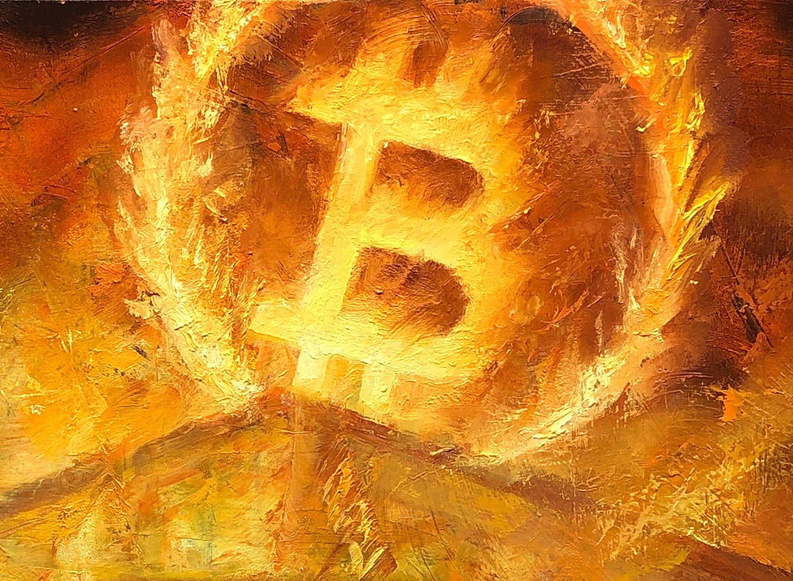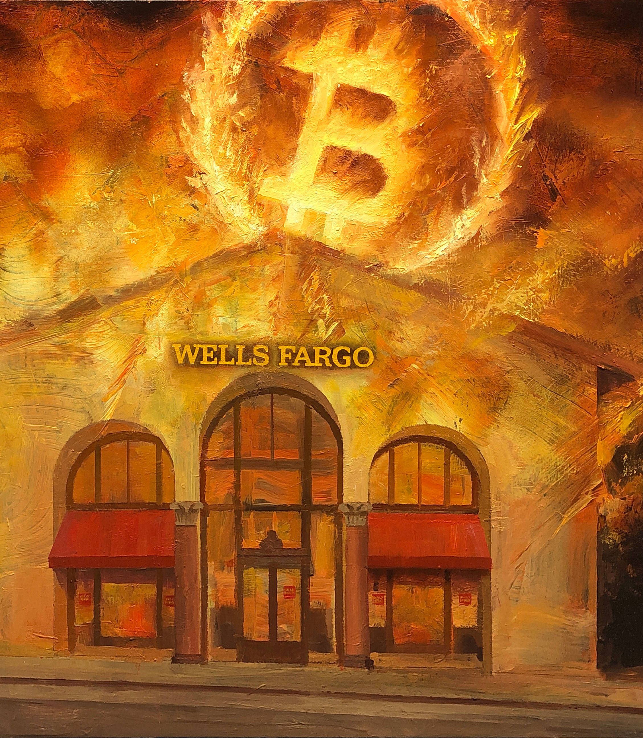 Wells Fargo in Flames, Oakland CA - oil on linen - 30 by 40 inches. 1 of 1 original painting by Alex Schaefer. This painting is part of an ongoing series of paintings of Too Big To Fail banks on fire that started in 2011 and continues to this day. It's a large painting, richly textured impasto paint and features an impressive fiery Bitcoin logo devastating the financial terrorist bank and crime against humanity Wells Fargo. A showcase piece for your art collection.