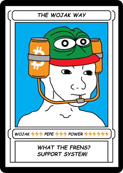 Physical WHATTHEFRENS is a development of the digital asset WHATTHEFRENS which is officially present in The Wojakway directory, card 3 of series 6. WHATTHEFRENS was only made one-of-a-kind, not because the intention was to make it a rare work, but rather because of the artist's inability to duplicate it.