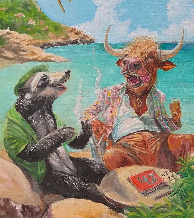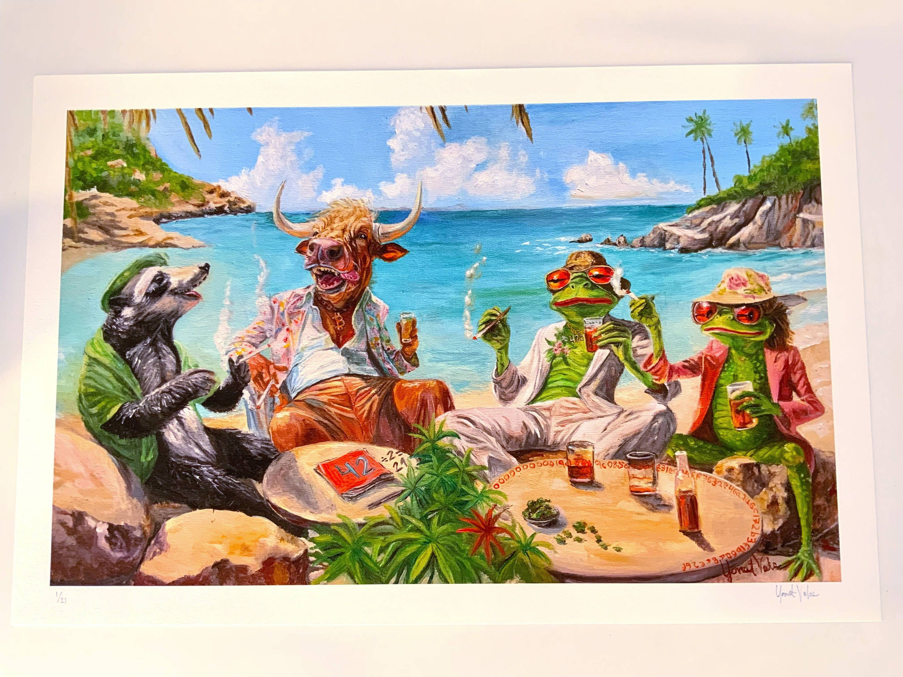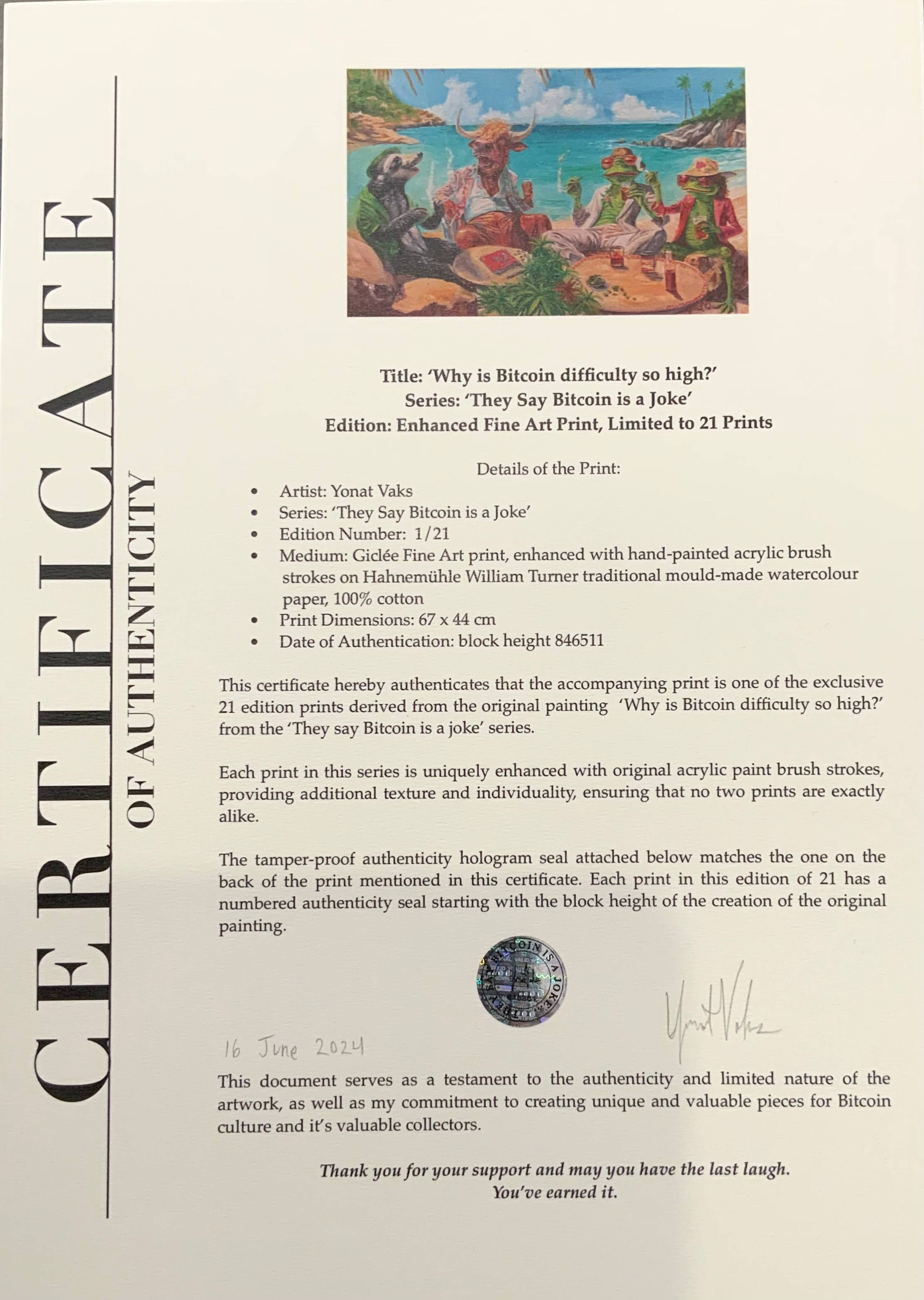 This auction is for print #8 out of the 21 Limited edition Fine Art prints of the original oil painting ‘Why is Bitcoin difficulty so high?' -Each print is uniquely enhanced with original acrylic paint brush strokes, providing additional texture and individuality, ensuring that no two prints are exactly alike. - Each print is numbered and signed. For additional safety, the back of each print contains a custom-made tamper-proof authenticity hologram seal, which is numbered starting with the block height of the creation of the original painting. - A signed Certificate of Authenticity is included with each print, that contains a seal that matches the one on the back of the print. - These are Giclée Fine Art Prints on Hahnemühle William Turner traditional mould-made watercolor paper, 100% cotton. About the original artwork (SOLD): The original artwork is an oil painting from the series ‘They say Bitcoin is a joke, but we’ll see who has the last laugh’. Each painting in this series is based on a known joke line, with recurring characters that always have the last laugh. Easter eggs are embedded in each one. Can you spot them? Thank you for your support and may you also always have the last laugh. You’ve earned it.