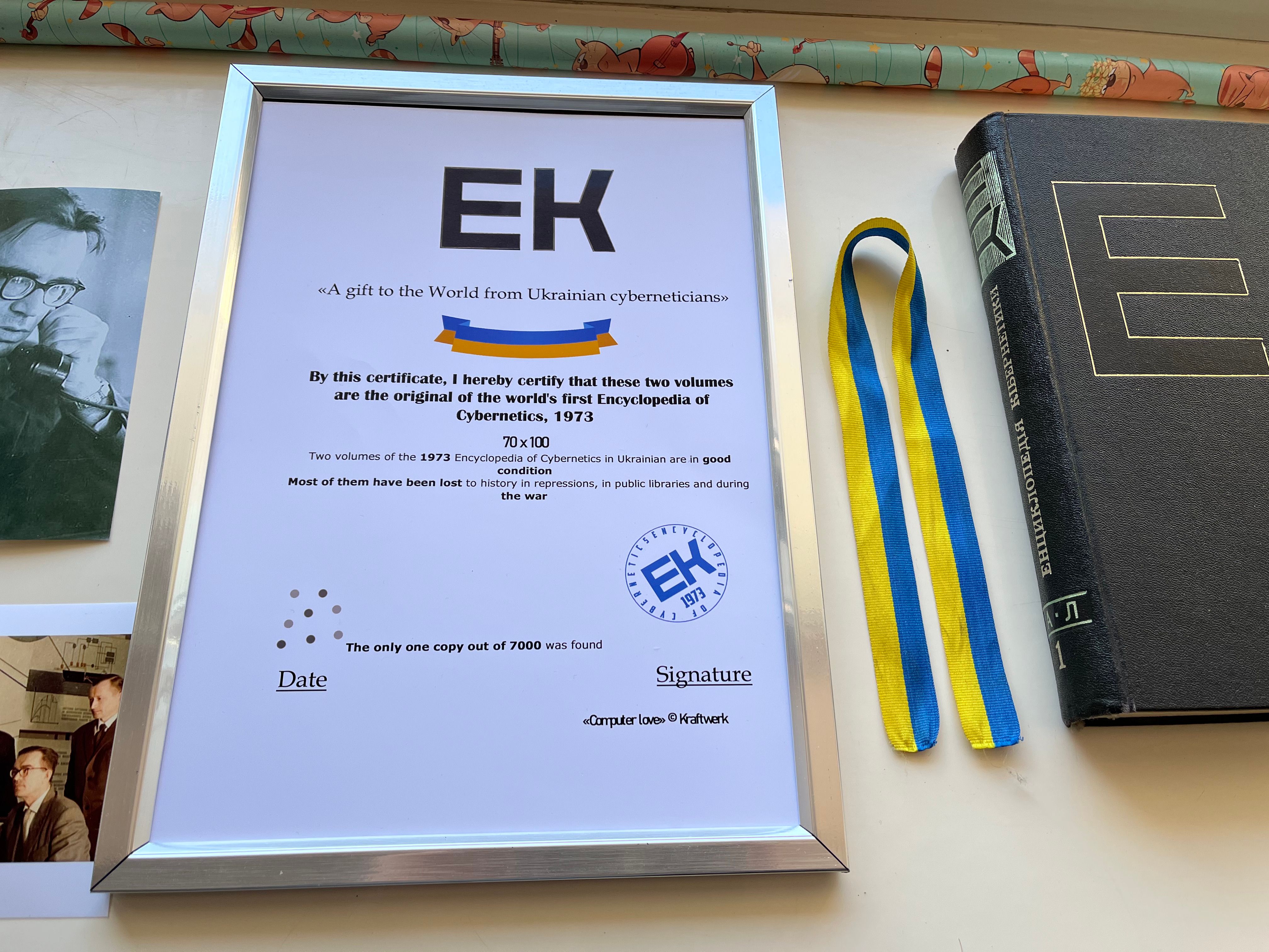 The set includes two volumes of the 1973 Encyclopedia of Cybernetics in good condition. And also: a certificate of authenticity, photos of the Ukrainian school of cybernetics with a signature (reproduction). And also my ribbon (washed) from the Ukrainian revolution of Dignity 2013-2014. You can find proof of the authenticity of the ribbon in this photo (it is hard to see here, but it is under the flag).