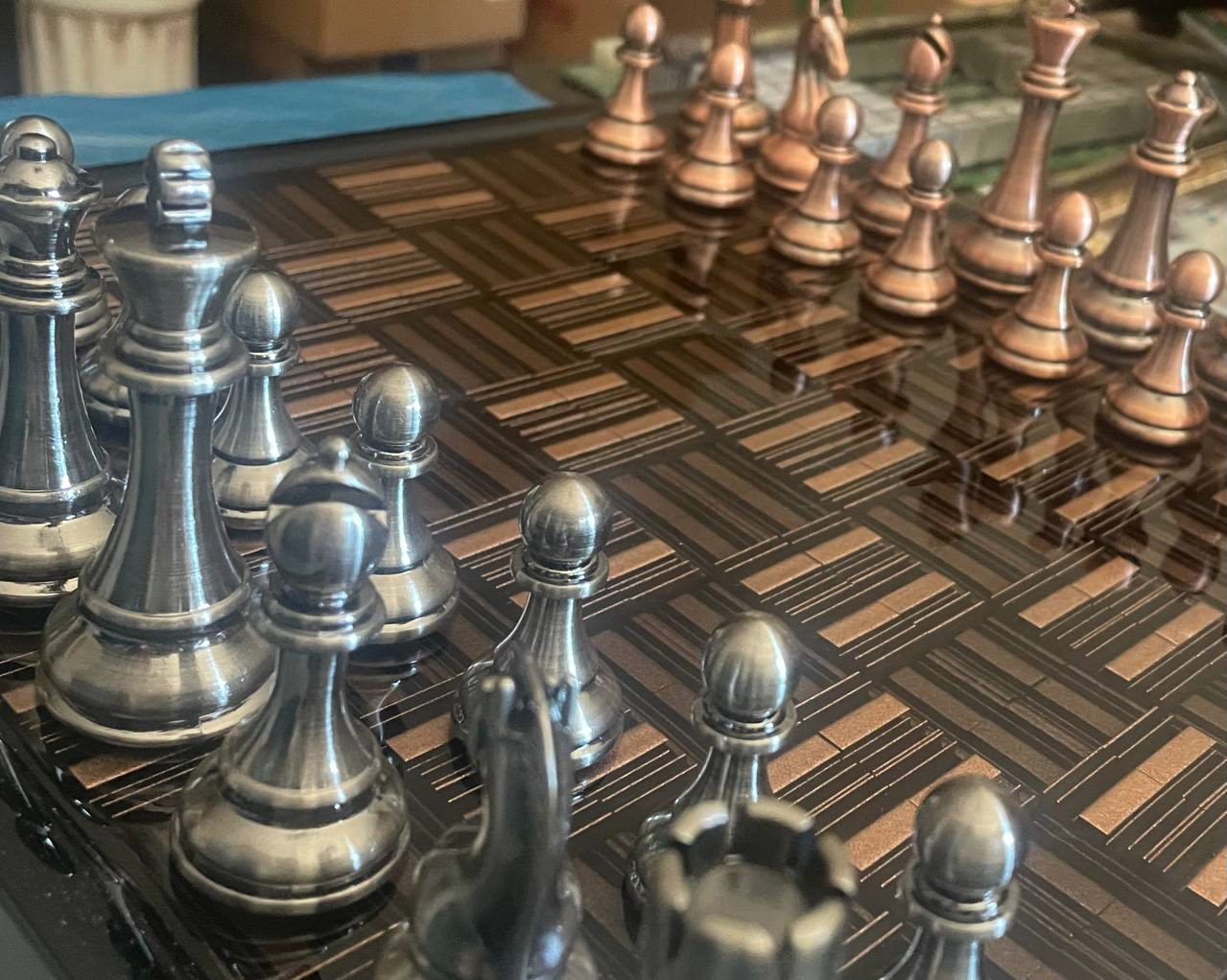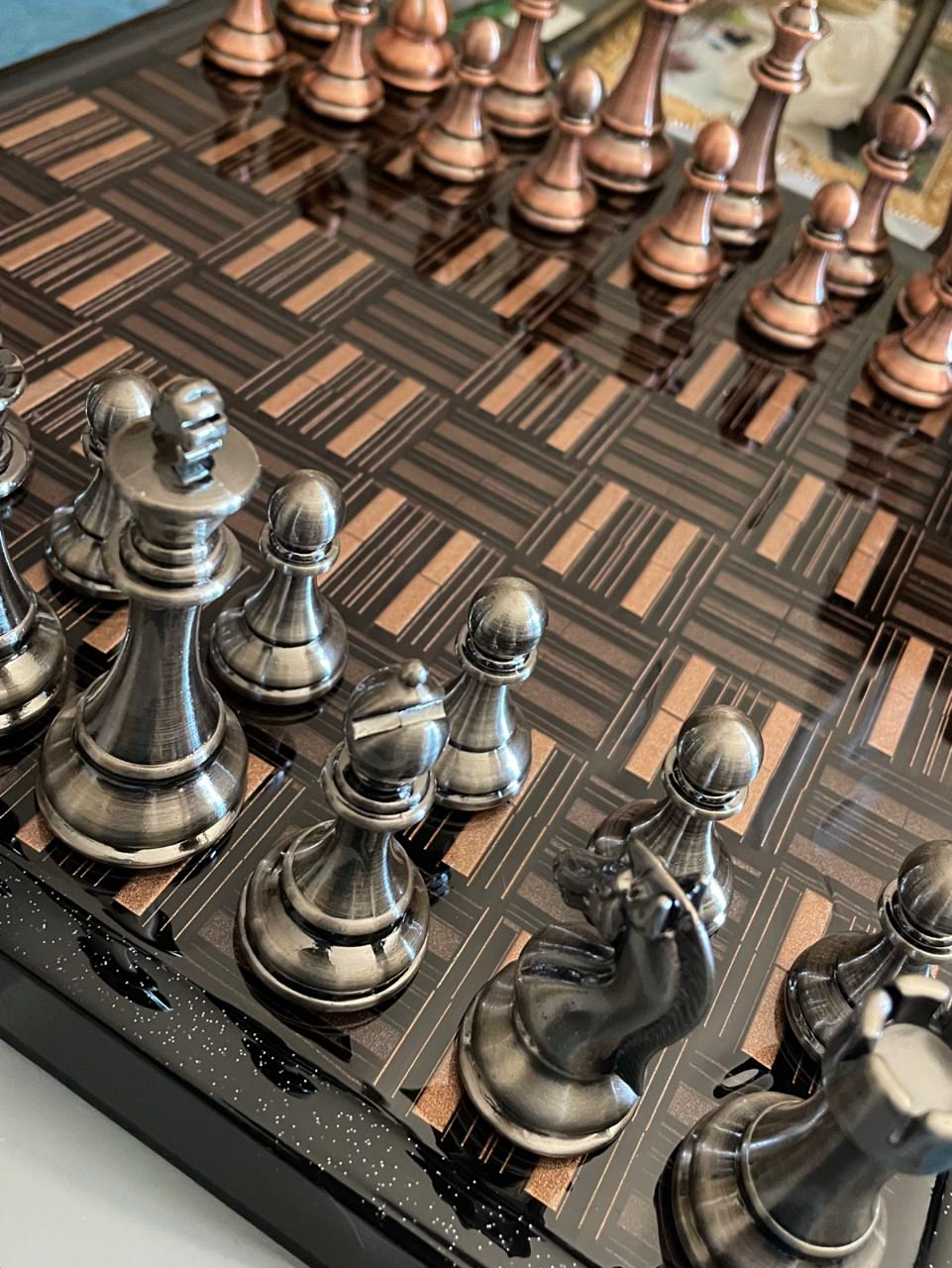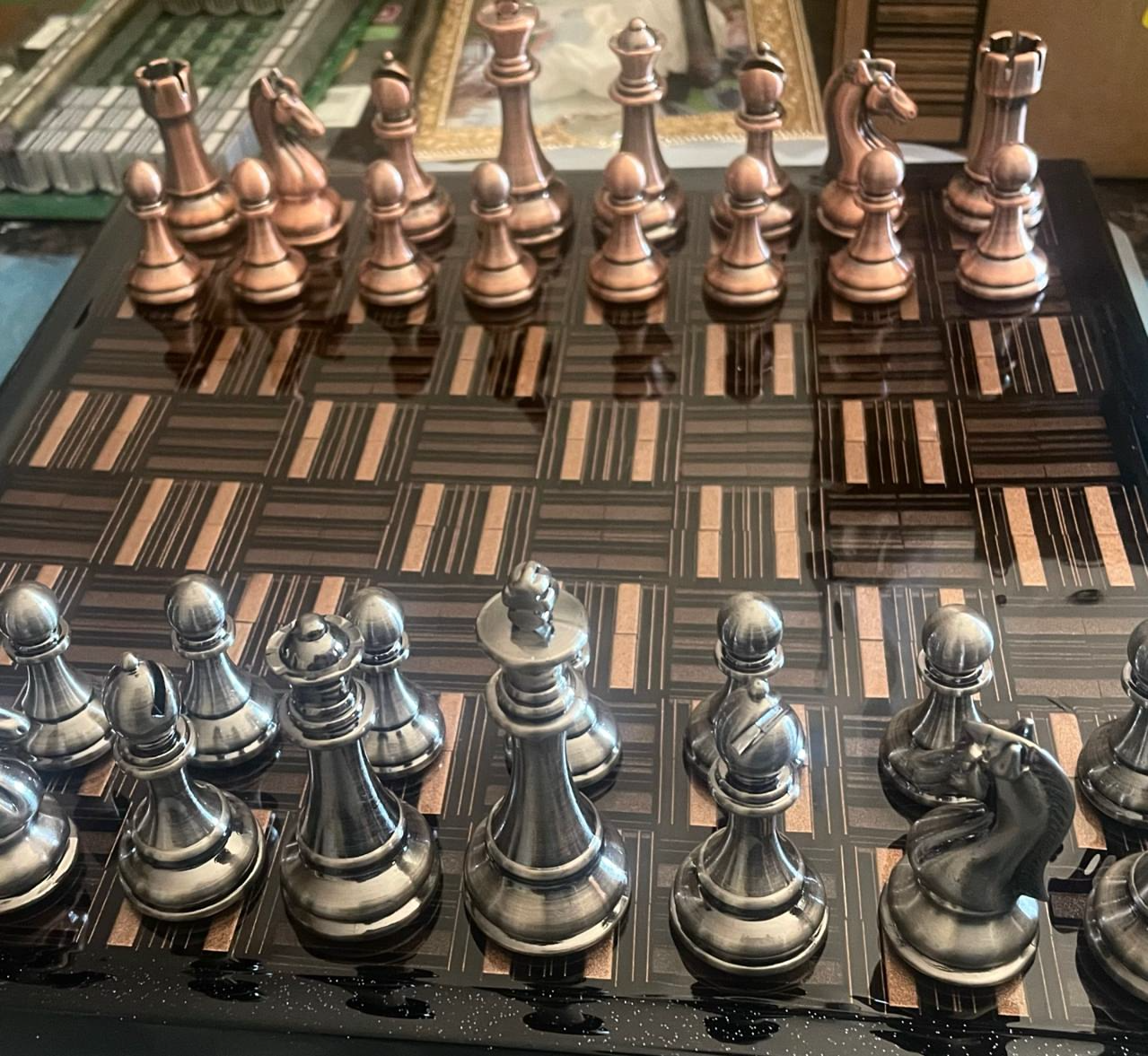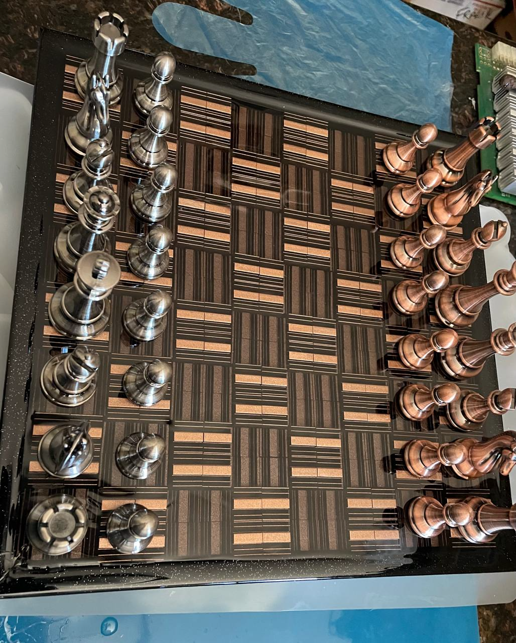This fully functional Chess Board is made with 256 hand painted heat sinks from hasboards used in mining Bitcoin. May be used or dispayed as art in your collection.