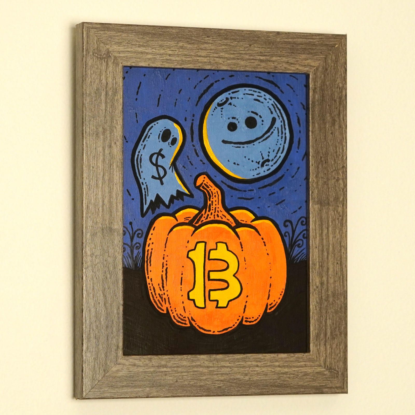 Halloween is the anniversary of the publishing of the Bitcoin white paper. Originally posted in 2008 by Satoshi Nakamoto. Celebrate this holiday with the orange pumpkin, fiat ghost, and smiling moon. This painting is done with acrylic and Posca paint markers on board. Comes in frame.