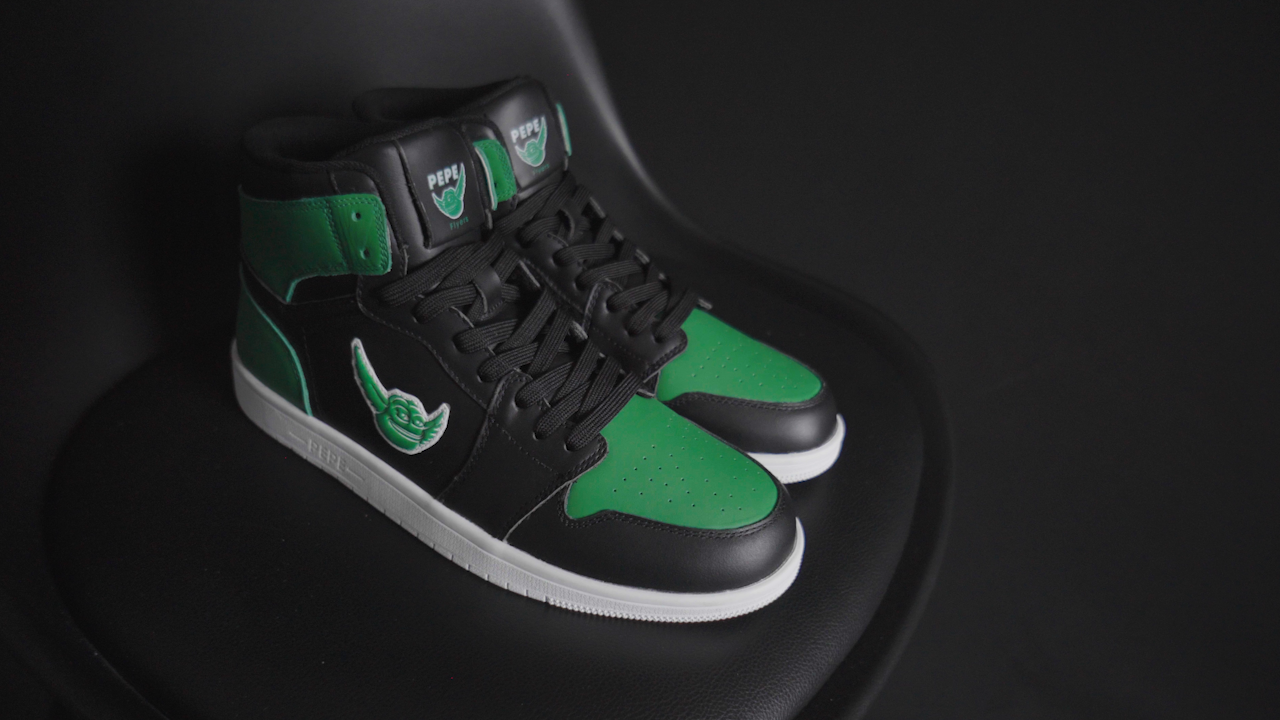 On the aesthetics, we've raised the top of these kicks and accented the beautiful pepe green with darkness. Now, ALL V2s are uniquely numbered on the tongue so you can boast your early status to late adopters. And what's that furry texture on the inside? You're damn right it's VELCRO, setting the stage for endless dank collabs and customization.