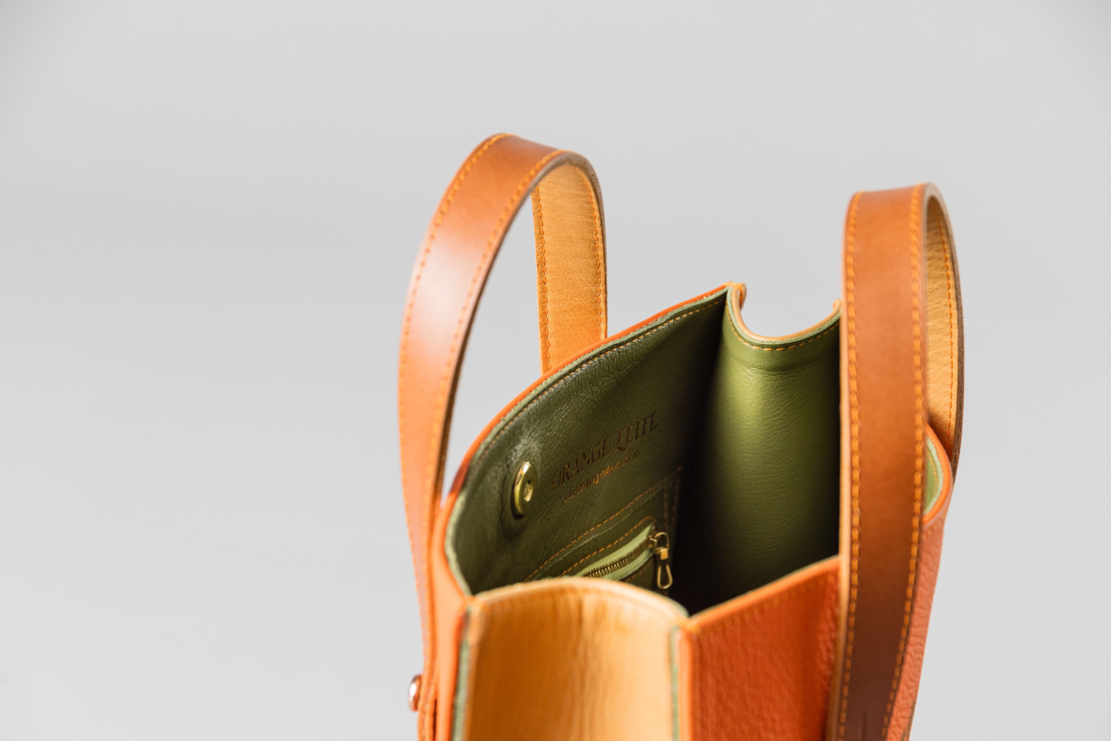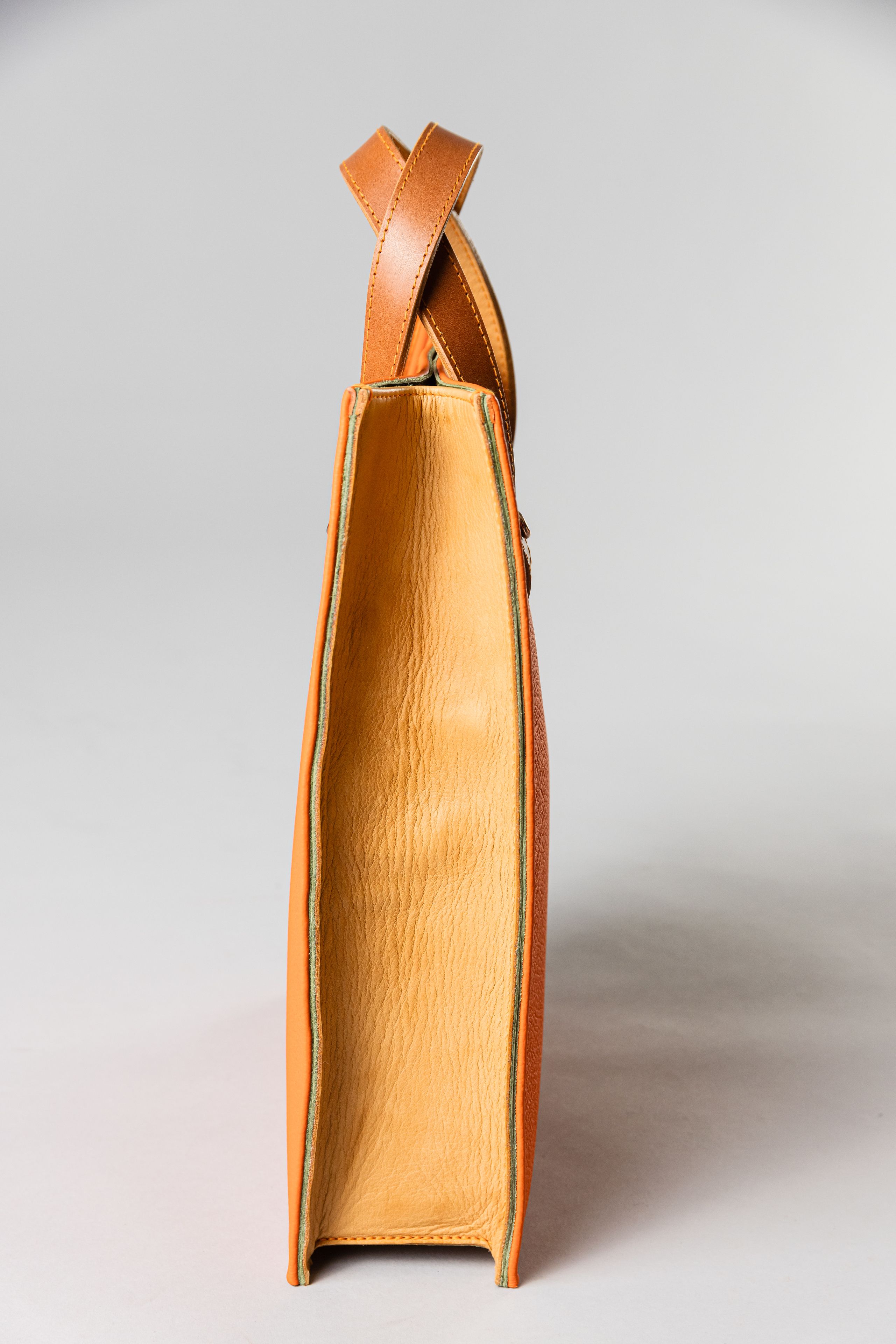 Crafted from structured full-grain leather in a softer orange tone, the bag has a clear, architectural silhouette that feels like a small, wearable block. The handles are elegantly shaped and fixed with metal hardware, giving it the feel of a hybrid between a classic handbag and a modern mini shopper.