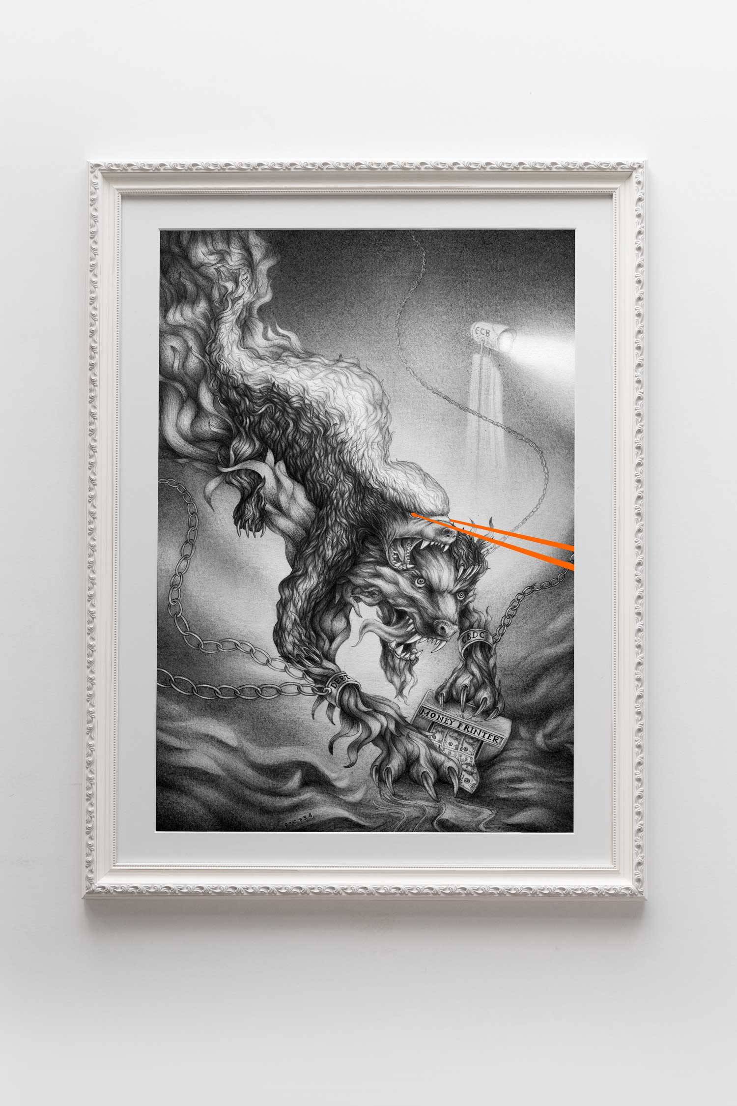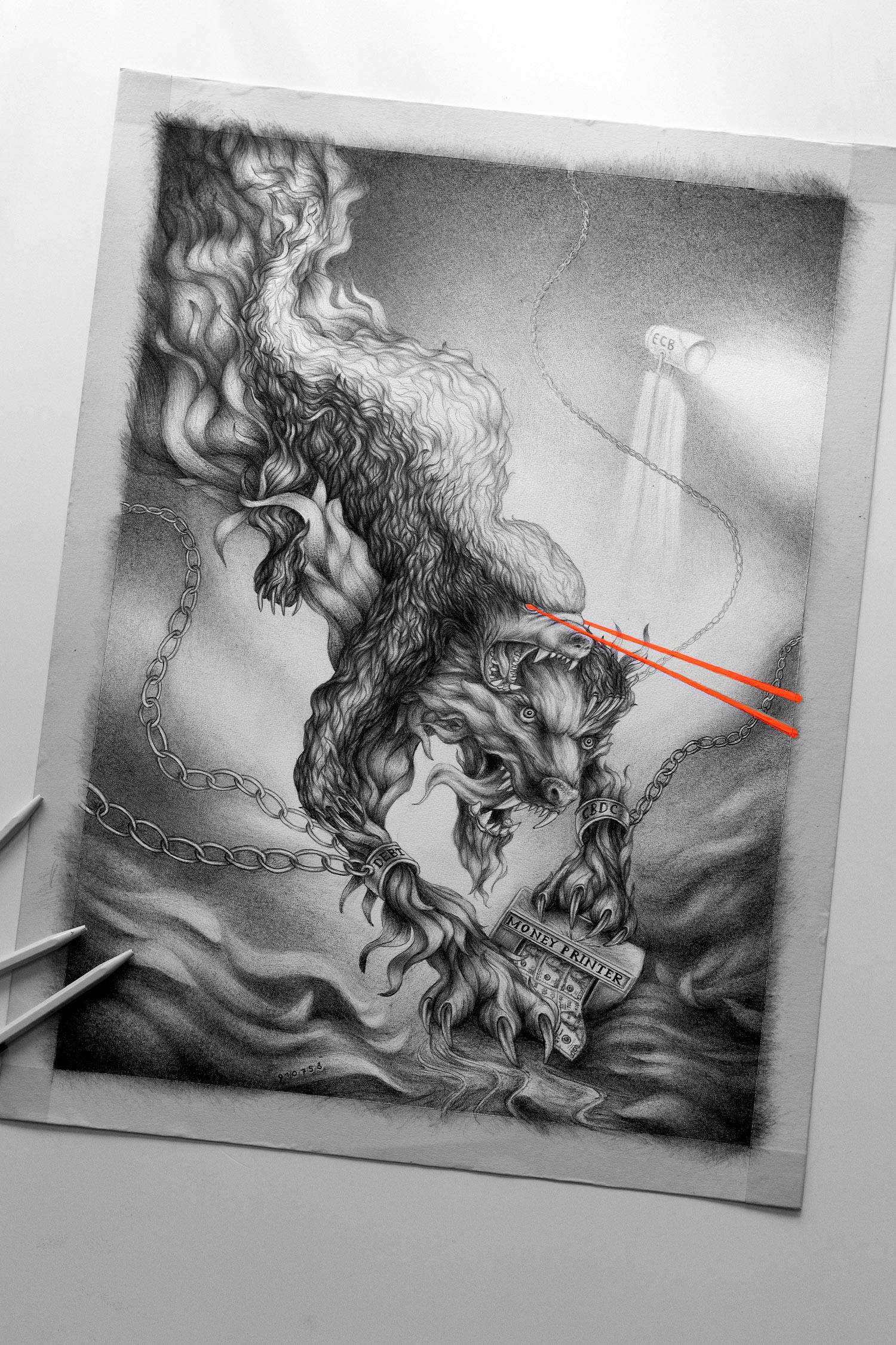 The Nordic myth of the powerful Fenrir wolf inspired me to create this artwork. To me, the struggle between today’s monetary system and Bitcoin as a tool of freedom for the people - the true separation of state and money - is the most important battle of our life time.