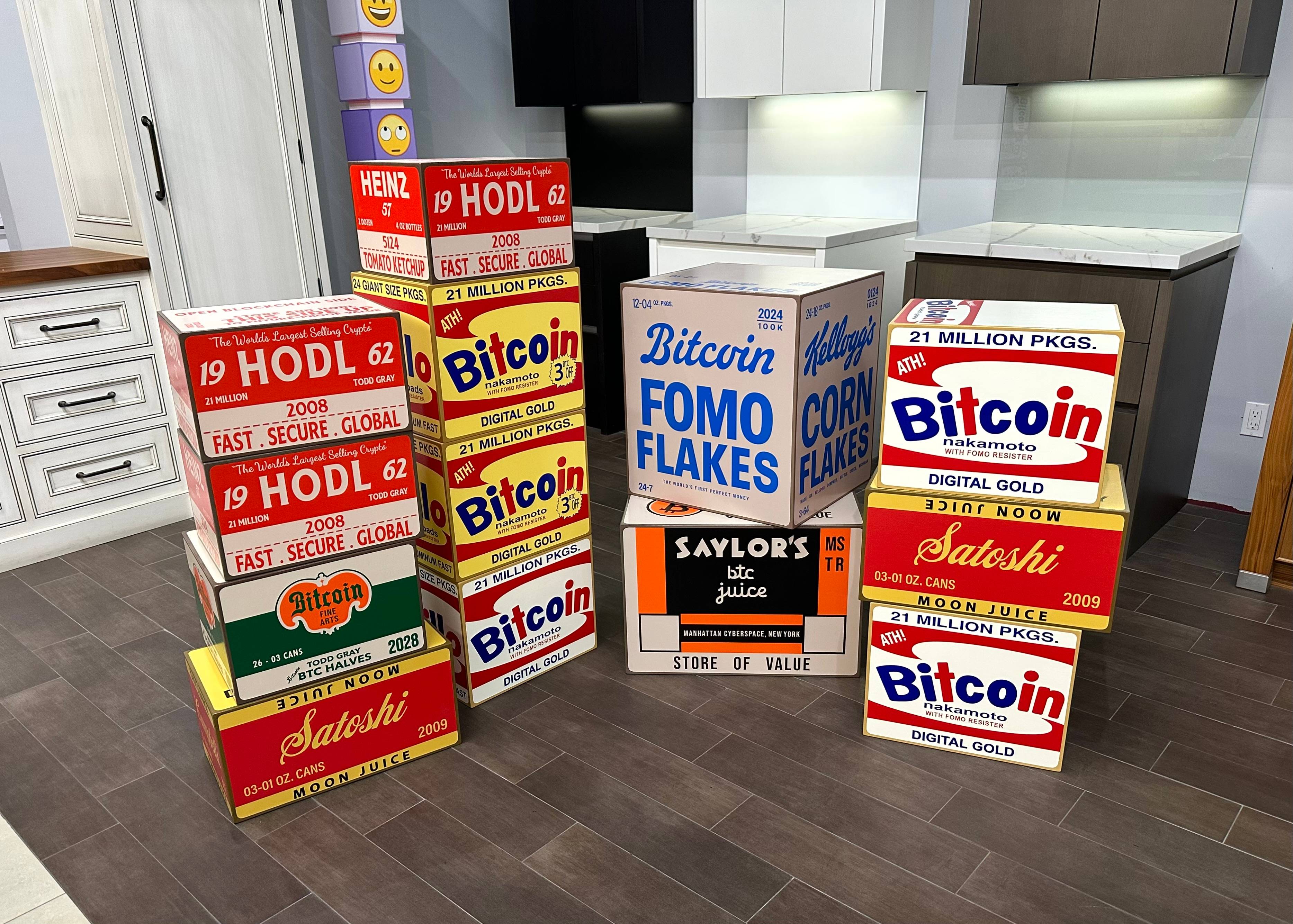 Andy Warhol inspired Bitcoin boxes. There are seven different styles. The complete set of seven has a gallery retail value of $22,900. For this Bitcoin conference there will be a special price of $12500 for the complete set. Open edition.