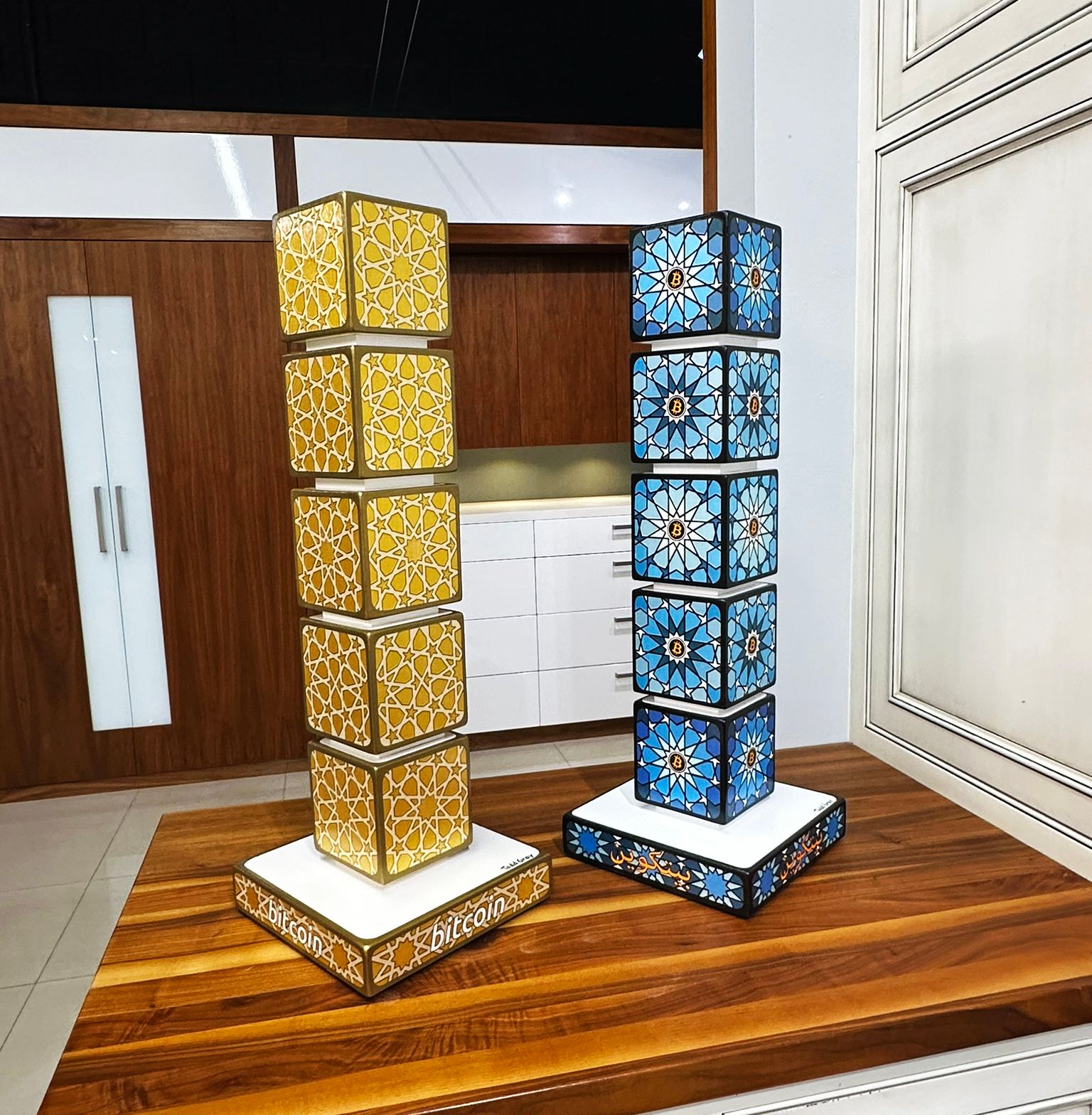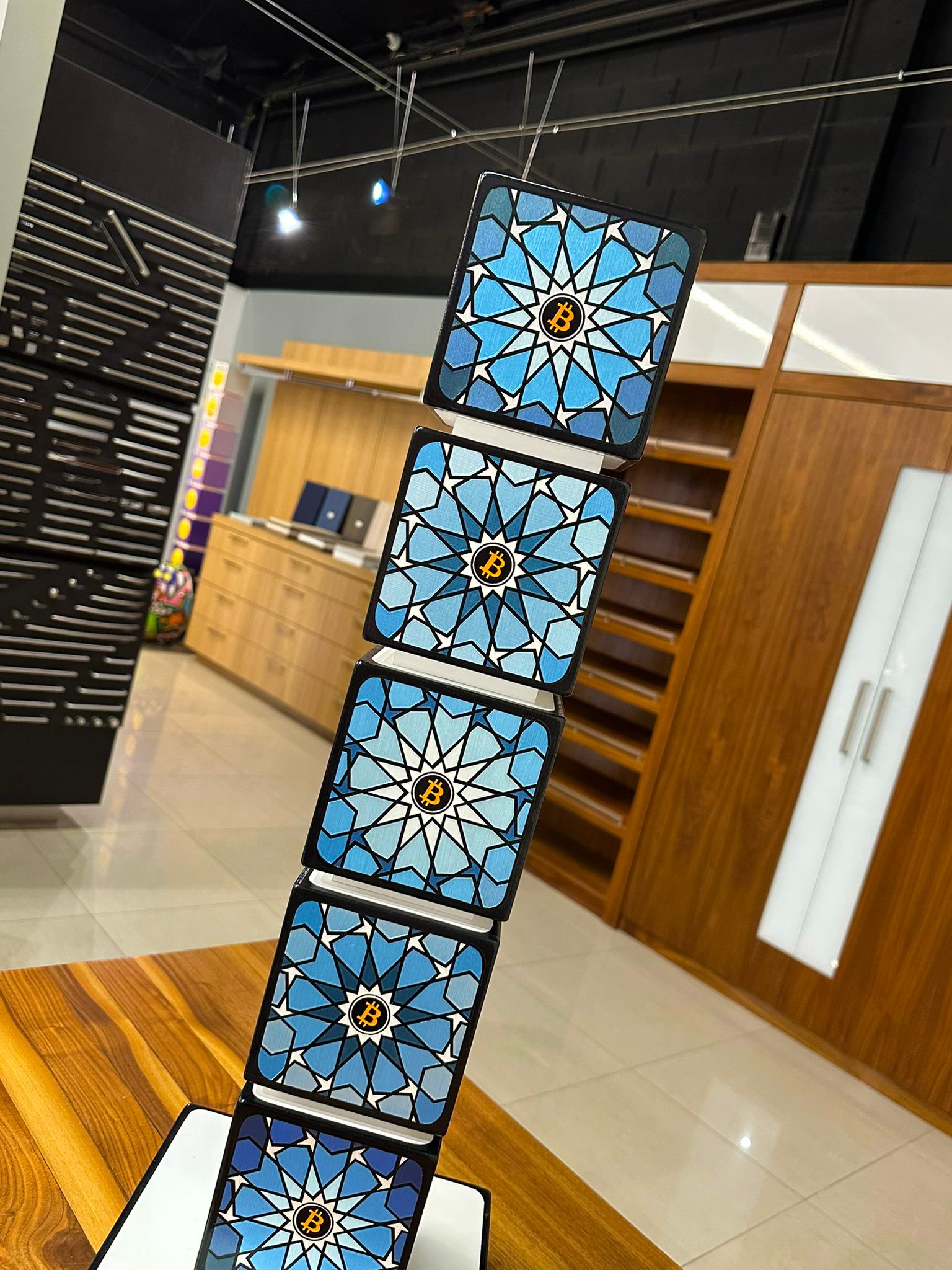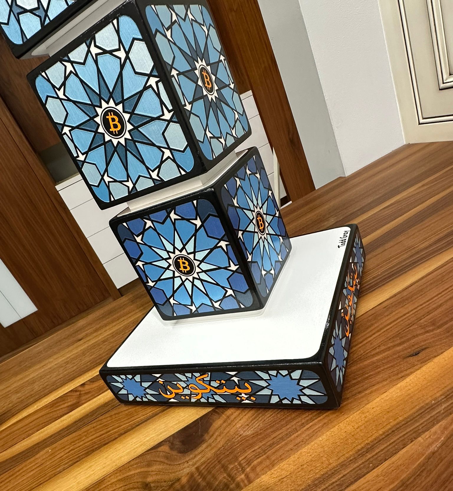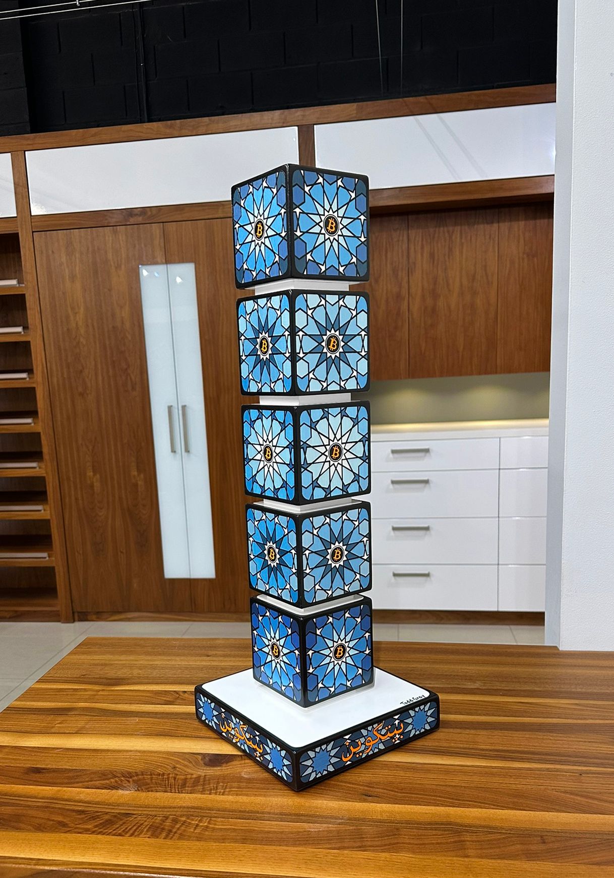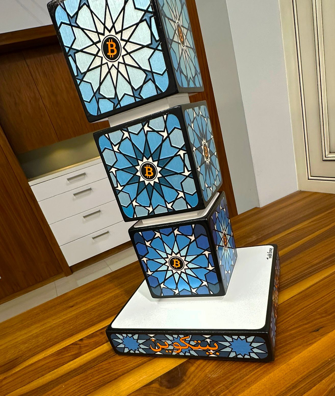 Noor (blue). I have been drawn to Islamic geometry for most of my life. It's beautiful. Complex Meaningful. Balanced. Sacred. And a hundred other things. I decided to paint this first piece in multiple shades of pearlescent blues. The pearlescent glows in amazing ways from different angles and is a metaphor for stained glass. I decided to make the center focal points, (the Bitcoin logo in orange with the word ‘Bitcoin’ painted on the base in Farsi. This was a very detailed piece. One of one original.