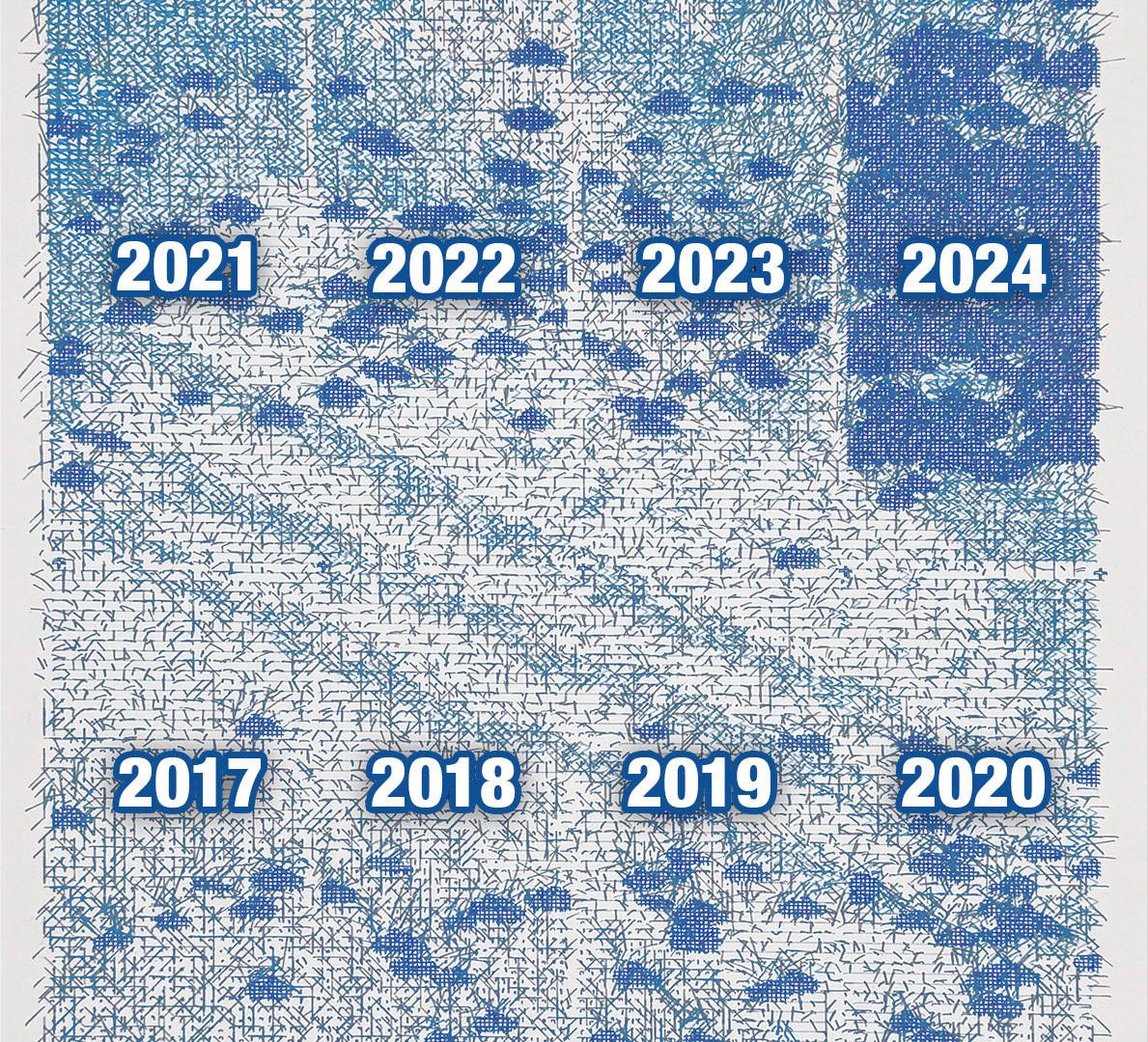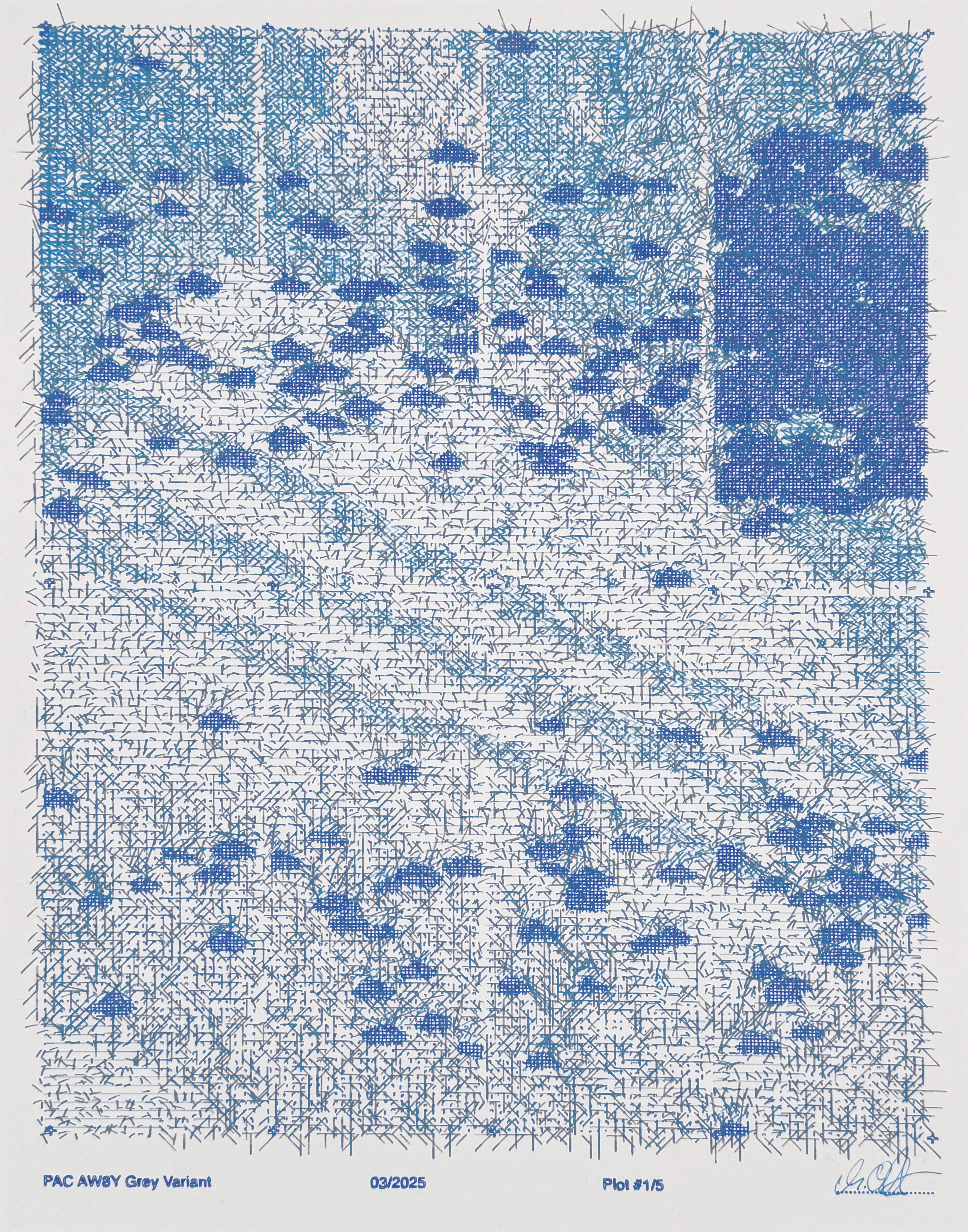 This artwork series celebrates the global adoption of Bitcoin through visualizations based on meaningful data. Each ch(Art) references specific growth metrics embedded in the title, with cloud forms representing the expansion of these values. PAC AN8Y visualizes the growth of active participants in the blockchain ecosystem based on wallet numbers. Cloud density corresponds to the adjusted growth rate over the past eight years. The rectangular layout follows a 2⁴ (16) structure, referencing the base-16 (hexadecimal) system used in encrypting wallet addresses and transactions.