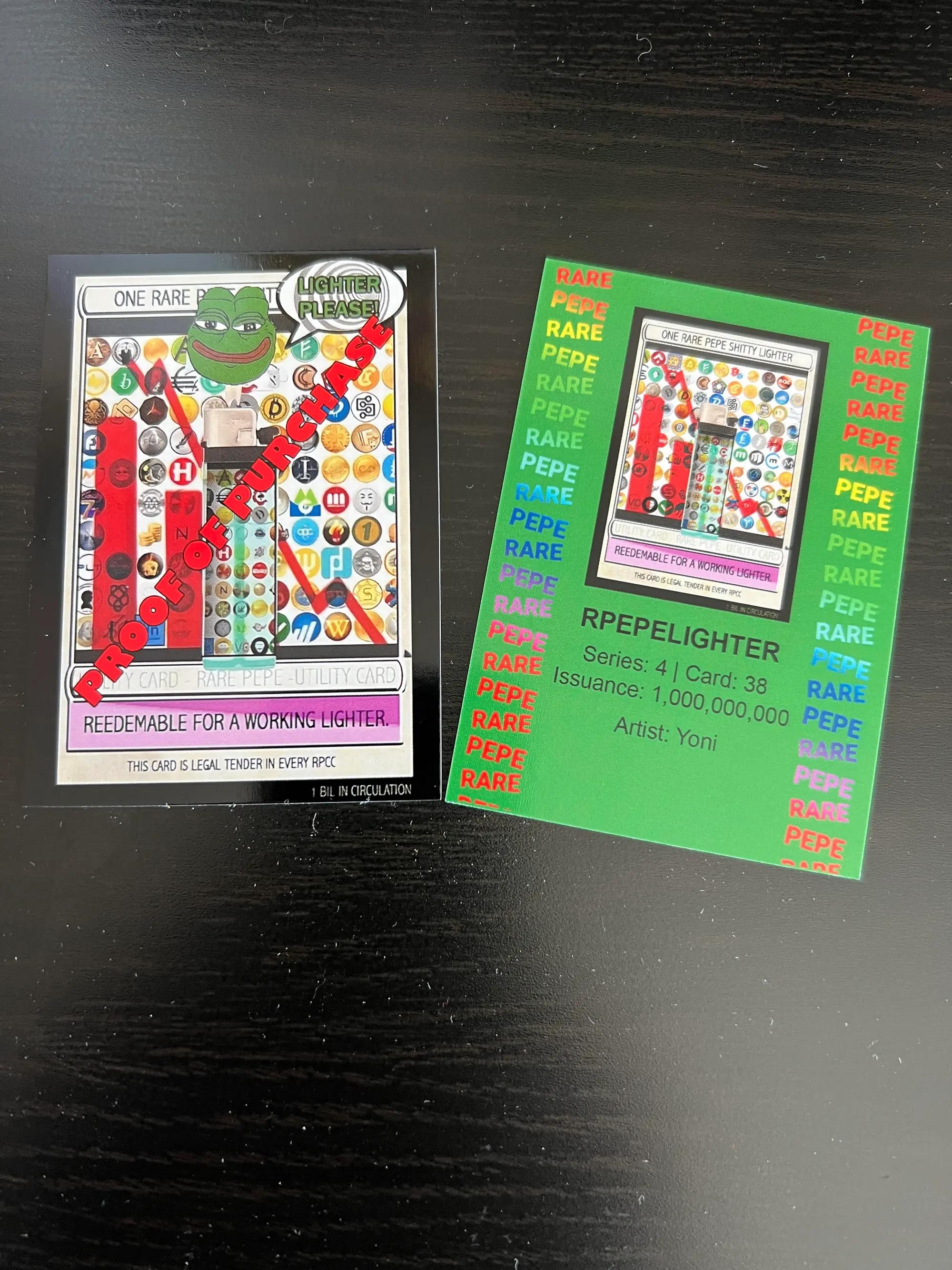 Limited edition real working BIC lighter that has been crafted to look like the one in Yoni's Rare Pepe Project Series 4 card RPEPELIGHTER. Purchase price includes (1) working lighter, (1) "Proof of Purchase" physical trading card, (1) physical lighter sticker, and (100) RPEPELIGHTER Counterparty assets. Sale of these lighters has been approved by Yoni and the sub-asset was minted by Yoni from his creator wallet.