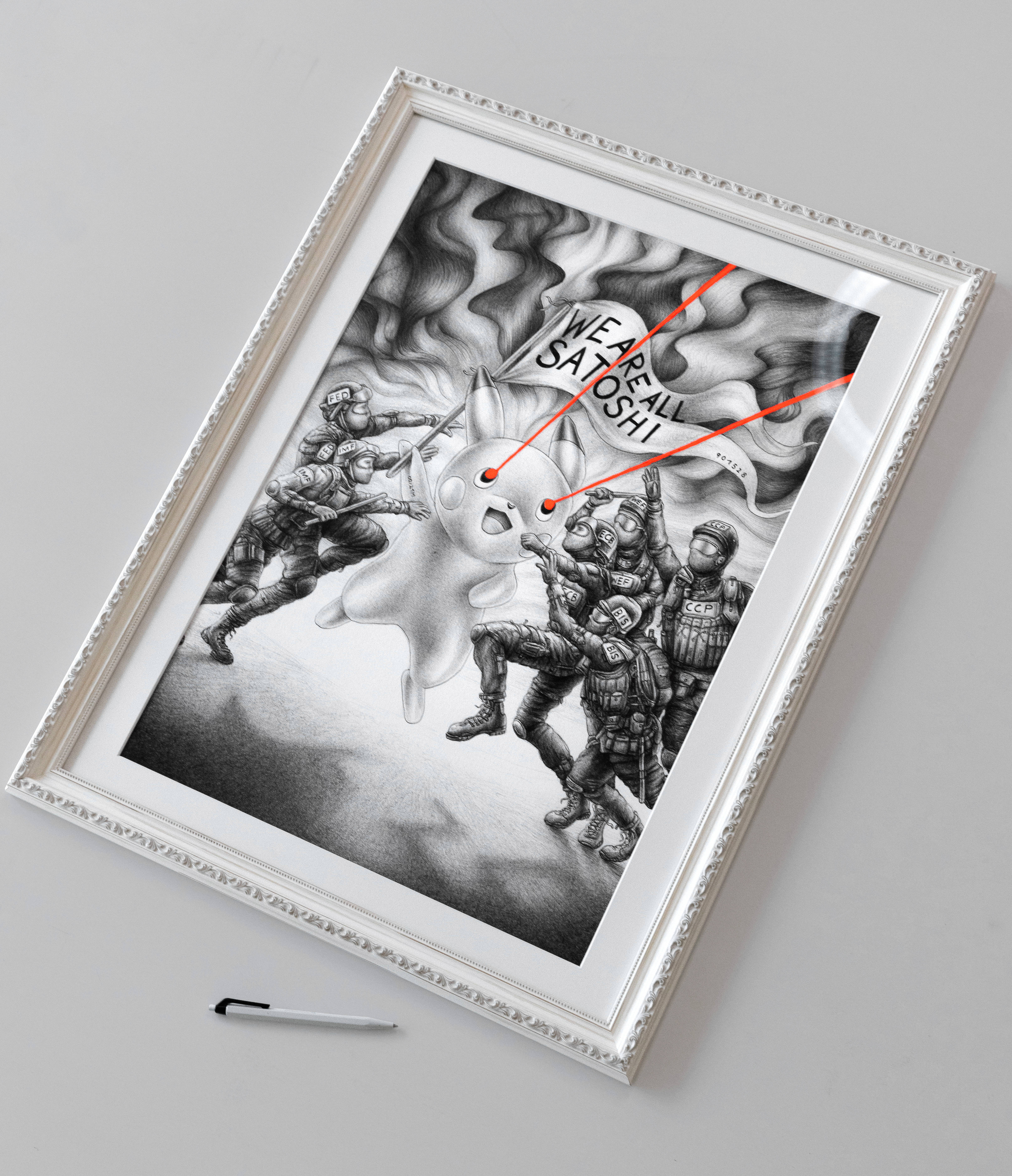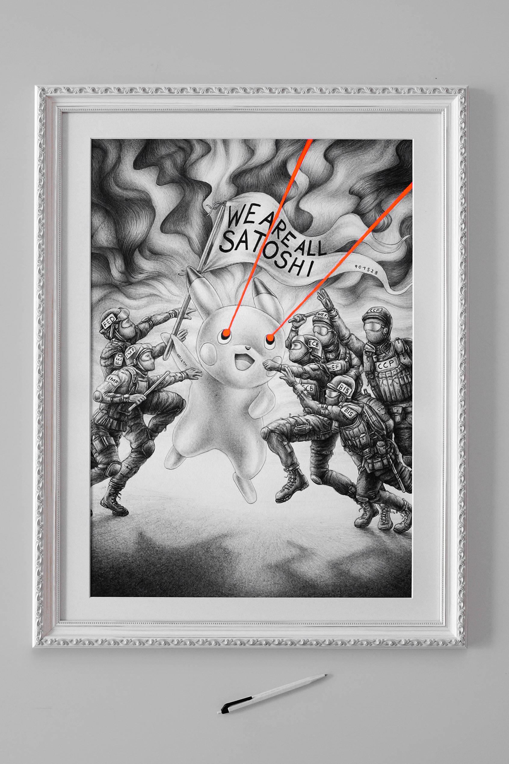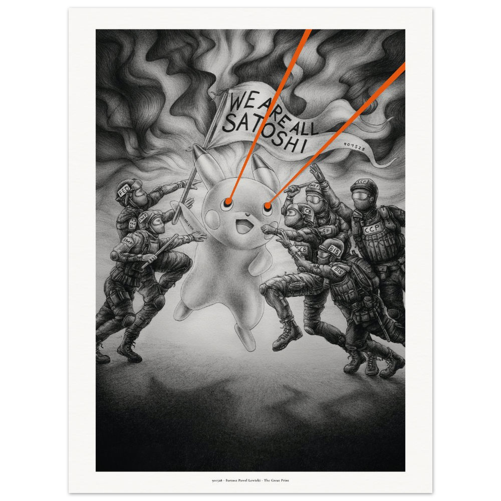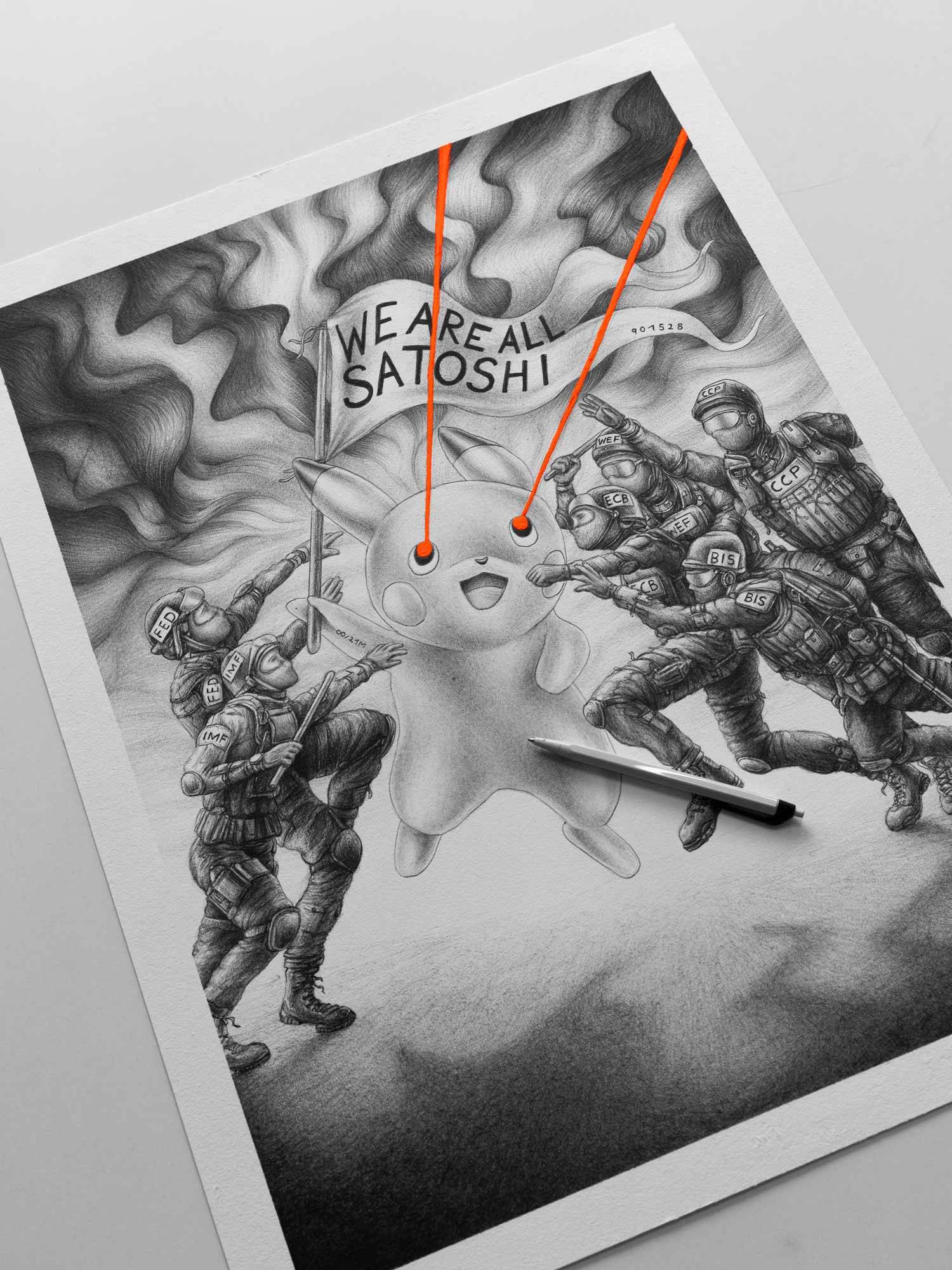 Since the early days of Bitcoin, the aphorism “We are all Satoshi” has been shared and repeated. Behind this phrase lies the idea that because Satoshi remains anonymous, the project itself matters more than the individual. The idea stands on its own - continuing to live and evolve, even if Satoshi no longer exists. During a protest movement in Turkey, someone appeared dressed in a Pikachu costume and was chased by security forces. That image sparked the inspiration for this work.